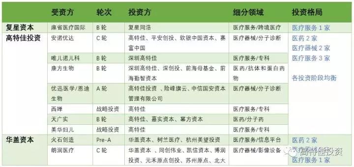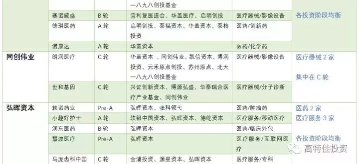 表5:知名医疗健康领域投资机构2017年投资格局