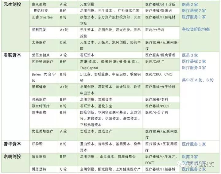 这10家投资机构在公开报道中涉及pre-A轮以前的投资未见。对医药中的肿瘤创新药,医疗器械中的分子诊断、影像设备,医疗服务中的专科医院仍情有独钟。