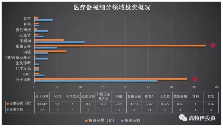 从表1、表2中,我们可以得知,统计周期内,发生医疗器械类投资62.5宗,涉及金额大于87.5亿,单笔平均投资额大于1.4亿。