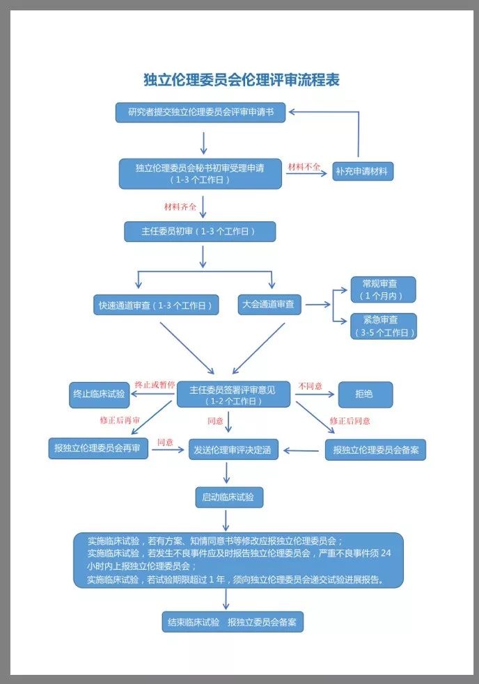 2017年12月8日,“上海市临床研究伦理委员会(筹)”(以下简称“临床研究伦理委员会(筹)”)经上海市卫生和计划生育委员会(以下简称“卫计委”)批准正式成立,主要负责对涉及人体的医学临床研究项目的伦理审查,保证临床研究符合伦理原则,保障受试者权益。 临床研究伦理委员会(筹)属上海医药临床研究中心(以下简称“中心”)附设性机构,由卫计委和徐汇区人民政府共同建设。 中共中央办公厅、国务院办公厅于10月8日印发《关于深化审评审批制度改革鼓励药品医疗器械创新的意见》中指出,各地可根据需要设立区域伦理委员会,指导临床试验机构伦理审查工作,可接受不具备伦理审查条件的机构或注册申请人委托对临床试验方案进行伦理审查,并监督临床试验开展情况。临床研究伦理委员会(筹)正是适应该意见的要求而成立。 为了推动和促进中心进一步符合国际规范和技术伦理标准的创新研究,保护研究参与者的权利、安全和福利,顺应中国生物医学研究快速发展的需要,独立伦理委员会依托中心于2008年正式成立。 作为国内第一家独立伦理审查机构,中心独立伦理委员会通过过去九年的工作,在伦理评审、伦理培训与能力建设、对外交流与合作、政策咨询等方面,已取得了突破性进展,形成了独立性、互补性、学术性、前瞻性四大鲜明特点,具备了一定的区域伦理审查工作的基础和能力。 大致流程 General Process 独立伦理委员会的伦理审查流程分为项目受理、伦理审查、决定传达、文件存档四步。 审查周期 Periodicity of the Review 如果采取会议审查形式,从受理到决定传达,一般周期为30个工作日;如果采取快速审查形式,从受理到决定传达,一般周期为15个工作日。 具体操作流程 Detailed Procedures 注:具体审查形式,将根据项目情况确定。如无特殊情况,伦理审查会议一般安排在每个月最后一周进行。 转自公众号:独立伦理委员会 关于独立伦理委员会: 一、成立与成长 为规范涉及人的生物医学研究和相关技术的应用,维护人类受试者的尊严、权利、安全和利益,加强对临床试验伦理审查工作的指导和监督管理,规范临床试验的伦理审查工作,保证临床试验符合科学和伦理要求,促进科学与伦理的良性互动,使我国的医药科学能健康有序发展,上海医药临床研究中心于2008年10月根据世界卫生组织“评审生物医学研究的伦理委员会工作指南”、联合国教科文组织“世界生物伦理与人权宣言”、我国卫生部“涉及人的生物医学研究伦理审查办法”及国家食品药品监督管理局颁布的“药物临床试验质量管理规范”,成立了独立伦理委员会(Independent Ethics Committee );并按制定的标准操作程序运作,其组成和运作完全遵循国际独立伦理委员会的指导原则。 目前,独立伦理委员会已进入第三届,新一届委员会朱伟教授为主任委员,牵头独立伦理委员会的工作,胡庆澧教授和沈铭贤教授为名誉主任和名誉副主任,参与委员会运作。其他成员包括知名伦理学专家、统计专家、临床医生、资深教授、法律专家以及社会人士等。上海医药临床研究中心独立伦理委员会办公场所设在上海医药临床研究中心内。 独立伦理委员会遵守国家宪法、法律和各项国家政策,尊重社会道德风尚和中华民族优良道德传统,汲取国内外最先进的生命伦理学成果,坚持理论联系实际,团结各相关领域的专家和各界人士,为维护受试者和公民的健康权益而积极工作。 二、标准操作规程制定依据 1.《中华人民共和国执业医师法》(1999) 2.《涉及人的生物医学研究伦理审查办法》(卫计委,2016) 3.《药品临床试验管理规范》(CFDA,2003) 4.《赫尔辛基宣言》(2013) 5.《药品临床试验质量管理规范》(ICH,1996) 6.《评审生物医学研究的伦理委员会工作指南》(WHO,2000) 7.《涉及人类受试者的生物医学研究的国际伦理准则》(CIOMS,2002) 8.《世界生物伦理与人权宣言》(UNESCO,2005) 独立伦理委员会依据上述法规、指南制订标准操作规程,并以其为工作依据,涉及人的生物医学研究伦理审查工作均按照相应的标准操作规程组织进行。 三、原则与功能 独立伦理委员会的组建和运行应遵循的基本工作原则是:合法、公正、独立、合格、多元、透明、及时和非营利。 在遵循公正、独立、多元、透明和不营利的原则下,上海医药临床研究中心独立伦理委员会主要承担以下功能: 1. 为涉及人的生物医学研究项目提供公正、独立的伦理审查; 2. 为临床研究相关人员提供培训和继续教育; 3. 对国内外涉及人的生物医学研究中的伦理问题进行研究,提出政策法规议; 4. 积极参与国内外医学伦理活动,加强国内外交流。 四、科学与伦理 我国“药物临床试验质量管理规范”、世界医学会的“赫尔辛基宣言”、国际医学科学组织委员会(CIOMS)的“人体生物医学研究国际伦理指南”,制定和确立了人体生物医学研究的伦理和科学标准。科学审查和伦理审查不可分割:涉及人类受试者的不科学的研究其本身就是不道德的。 独立伦理委员会审查生物医学研究的目的是为了保护受试者的权益和安全,依据上述指南对人体生物医学研究项目在科学性前提下进行独立、称职和及时的伦理审查,必要时伦理委员会可邀请专家或/和特殊人群的代表列席提供咨询意见。 第三届独立伦理委员会成员名单 主任委员: 朱 伟 复旦大学应用伦理中心、社会科学基础部教授;