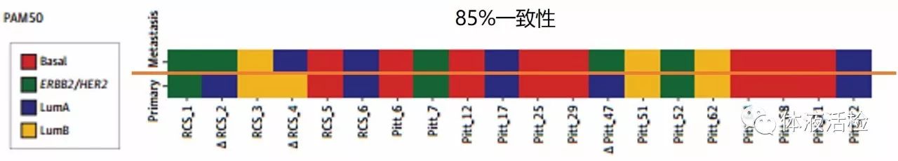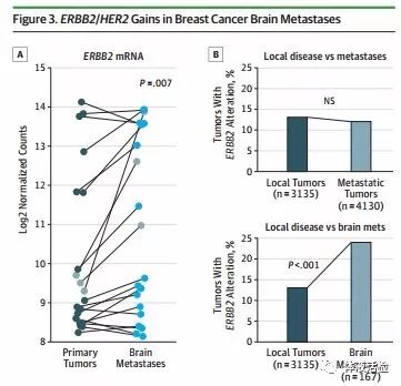 本着悬念要层层展开的理念,研究人员先进行了一番欲扬先抑的结果展示。 图1 原发灶与脑转移灶中固有分子亚型情况 铺垫部分就告一段落了,下面进入传说中的神转折部分。 图2 具有临床意义的10个基因在BrM患者中的表达变化 图3 局部乳腺癌、转移性乳腺癌、脑转移乳腺癌患者ERBB2/HER2表达水平差异 种种现象说明,乳腺癌向脑部转移确实是有迹可循的,HER2表达上调是脑转移的一种潜在标志物。如何利用这一现象为患者提供临床收益?第一,更早地发现转移风险;第二,对症下药。循环肿瘤细胞(circulating tumor cell, CTC)具备兼顾这两个应用点的潜力,已有研究显示转移性乳腺癌患者其原发灶、CTC、转移灶HER2表达状态不同,即便原发灶HER2-,但CTC HER2+的患者仍可从靶向治疗中获益。另一篇推送中也提到过CTC发展为脑转移的一系列分子层面的变化,因此CTC或可用于及早发现转移风险。 相关推送链接:预测乳腺癌脑转移,CTC又立功 参考文献:Priedigkeit, N, et al. "Intrinsic Subtype Switching and Acquired ERBB2/HER2 Amplifications and Mutations in Breast Cancer Brain Metastases." Jama Oncology 3.5(2017):666. |