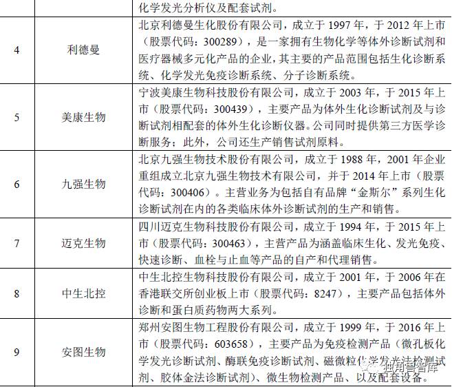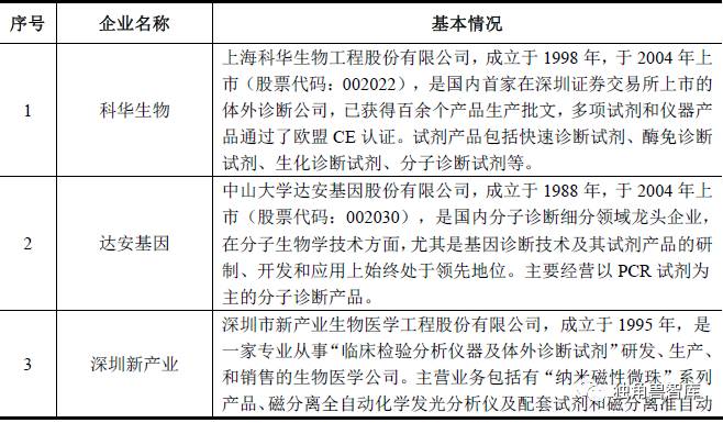 公司肿瘤标志物系列产品的主要竞争对手为外资品牌,如罗氏、雅培等,国内企业在该领域起步较晚,规模普遍较小,主要市场参与者为深圳新产业、安图生物等公司;公司HPV系列产品的主要竞争对手为国内企业,如凯普生物、亚能生物等。国内体外诊断行业主要企业还包括科华生物、达安基因、利德曼、艾德生物、九强生物、迈克生物、中生北控、美康生物等企业,上述企业的基本情况如下: 1、透景竞争地位