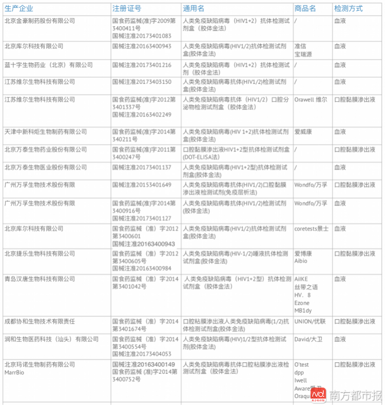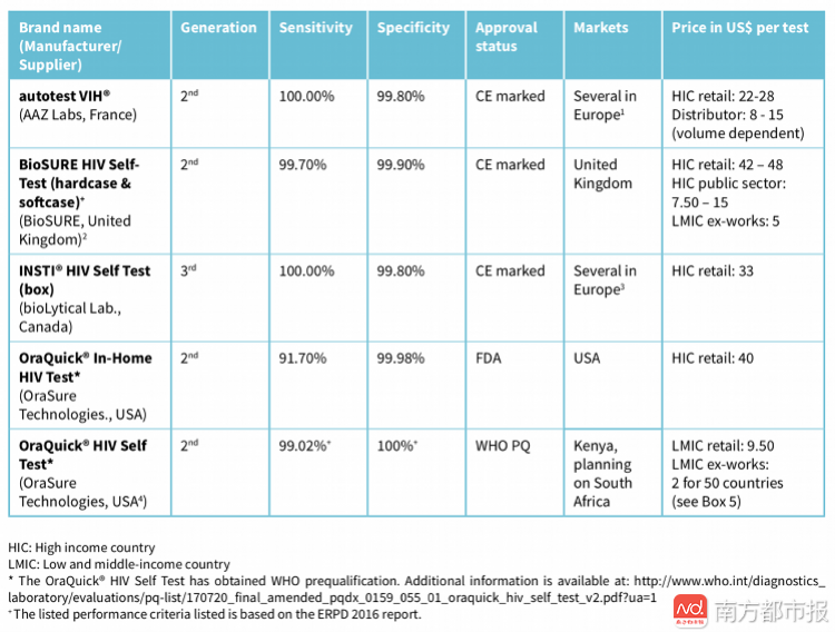 南方都市报记者对互联网电商上出售的HIV快检产品做出的梳理与盘点。 国际上,自检产品的上市也是这两年的事儿。2002年,美国食药监局FDA批准了第一个快速HIV口腔黏膜渗出液检测试剂——OraQuick快速HIV抗体检测试剂上市,利用口腔黏膜渗出液样本直接检测HIV抗体;但直到2012年,FDA才批准OraQuick In-Home HIV Test为第一个非处方的HIV快速自我检测试剂。它要求使用者自己采集口腔黏膜渗出液样本,检测并最后读取检测结果。 目前,国际上专业型快检产品有50余种,通过监管部门评估、标注为Self Testing或者Home Testing的自检产品只有4家(其中口腔黏膜渗出液只有1家,其余三家为血液检测),获得WHO预认证的产品也只有一款,2017年7月刚获批。