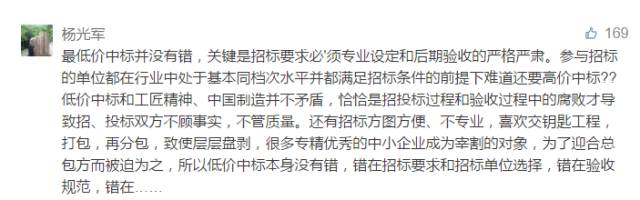 2017年5月31日,《人民日报》发文《质量应是企业立身之本(一线视角)》,首次诟病最低价中标。
