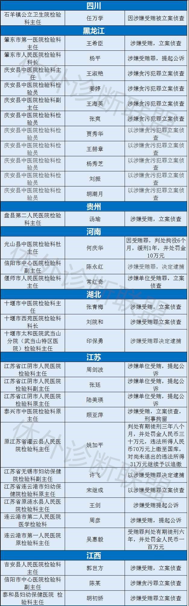 大家好,我是小V。 今天是周日,风和日丽,阳光晴好。睡得很好吧大家 这18年才刚刚开始半个月,小V又来提醒各位了:“要政治正确啊”。马上过年了,奖金绩效该拿的一分不能少啊,不该拿的可千万别伸手。小心“烫到”自己! 2017年一整年检验科又有多位院长主任落马,9个省34个检验科人员因涉嫌贪污被起诉。,其中黑龙江省的最多,11个。你说这马上要过年了,糟不糟心。大家可要吸取教训,宁愿少吃一块肉,也不多拿一分钱。 小V做了一张所有落马人员的整合图,请大家看看 这些都是检验科的落马人员,跟大家分析一下贪污受贿的源头在哪里,大家以后引以为戒。 1. 医疗器械公司行贿 从各地的案子来看,科主任的受贿来源主要是医疗器械公司,大多和检验试剂的采购有关。 尽管检验科主任在大型医疗设备的采购上没有拍板的权利,但在普通的检验试剂采购中却有着决定性的话语权。受贿主任中有的表示试剂采购时自己有至关重要的推荐权,有的表示医院会直接根据自己列出的产品目录进行采购。 2. 检验科的“潜规则” 在检验设备、试剂销售方面,很多检验科都有着不成文的暗规矩。 举个例子:检验科会在购进体外诊断试剂的过程中,按照试剂售价的3%~10%向企业收受回扣。相关回扣款,是以入外账的形式用于科室集体活动、发福利等。对此,泰州市海陵区法院将这种行业常见的“赞助费”,一锤定音地判为“行贿”。 如此判决,值得业内企业警醒!