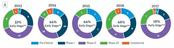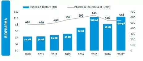 1、2017年美国生物医药领域风险投资情况 美国健康领域风险投资的募资金额创新高,达到91亿美元,比2016年增长了26%。 生物制药、医疗器械和诊断技术公司获得的投资创新高,达到155亿美元(其中生物制药105亿),比2016年增长了31%。 生物制药(Biopharma) 由于投资者在早期技术的赌注加大,生物制药领域的A轮融资创新高(27.8亿美元)。A轮融资的全年平均交易金额是900万美元,有趣的是第1 季度和第4季度获得A轮融资的公司数量和金额都是全年平均值的2倍。 公司机构投资者更偏向于早期阶段的公司。GSK SR one,辉瑞(Pfizer),新基(Celgene)和GV投出了最大的几笔A轮。Alexandria投资的数量最多(26次),但是平均每笔投资小于200万美元。 在细分领域方面,投资者偏向于肿瘤领域和平台型公司。癌症领域领跑所有适应症,在融资数量和金额上都是排名第二(平台型公司)的两倍以上。平台型公司因为具有解决跨适应症的潜力而获得青睐。接下来依次是孤儿药/罕见病、神经系统疾病、自身免疫性疾病和抗感染领域。 在地域方面,马萨诸塞州和北加利福尼亚地区的创新公司活力最强,表现为融资交易数量和金额排在前列。