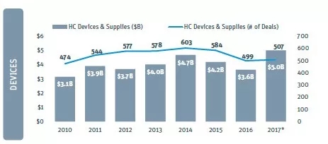 ▲美国生物制药领域投资趋势(2010-2017) 医疗器械(Device) 融资活跃度与2016年持平,但是A轮融资增长了40%,达到3.4亿美元,其中无创监测、整形外科和神经学领域的医疗器械公司最为热门,占到总金额的68%。2017年,无创监测设备这一细分领域不再是心血管疾病一统天下,64%的融资来自于泌尿/妇科、神经学、呼吸系统、代谢、眼科等其他疾病领域。 公司机构者的投资增长了2/3,他们更偏向于晚期阶段的公司。Keiretsu Forum,强生,波士顿科学,GSK,LSP,KCK Group都投资了5家以上的医疗器械公司。 孵化器和专注特定领域的投资者更关注神经学领域;无创监测仍然受到关注,虽然融资金额不大,因为这些公司开发成本小同时监管要求相对较松;随着治疗转移到院外,给药系统领域将获得持续增长;血管介入领域出现萎缩趋势。 在地域方面,北加利福尼亚地区的创新公司活力最强。