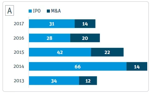 ▲2017年NGS公司估值暴涨 2、2017年美国生物医药并购和IPO情况 生物制药领域IPO总数为31家,比2016年(26家)有所增加,并购交易(14起)比2016年(20起)减少。 生物制药领域的退出价值(exit value)降低,但是IPO交易前估值大幅增加,平均值达到本轮周期(2013-2017)的最高纪录。 生物制药领域的并购主要发生在早期阶段(pre-clinical和Phase I)的公司,平均退出时间3.5年(从A轮融资算起),为近5年最低。 生物制药领域的IPO以后期阶段(phase 2和Phase 3)的公司为主,其中63%是癌症和罕见病领域的公司。 医疗器械领域IPO总数为3家,并购交易14起,与2016年情况相当。 诊断技术领域仅有1家公司IPO,无并购交易。