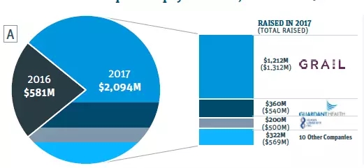 ▲2017年液体活检领域融资激增,前3家公司占了总融资额的85%
