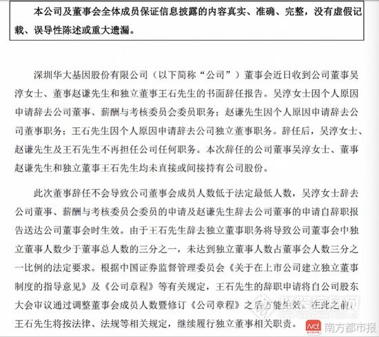 1月19日,华大基因发布晚间公告称,董事会近日收到公司独立董事王石的书面辞任报告,王石因个人原因申请辞去公司独立董事职务。