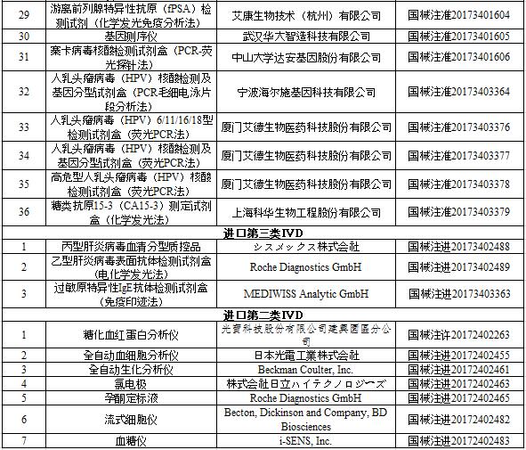 2017年12月,国家食品药品监督管理总局共批准注册IVD产品共46个,包括境内第三类IVD产品36个,进口第三类IVD产品3个,进口第二类IVD产品7个。(摘自:总局关于批准注册医疗器械产品公告(2018年第4号)