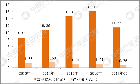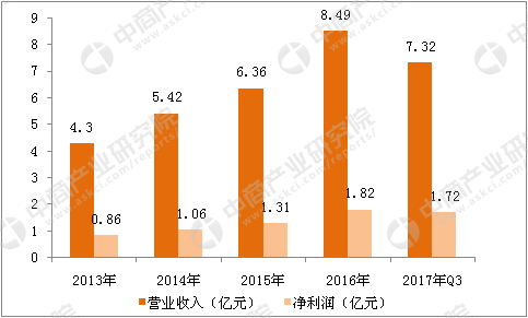 数据来源:中商产业研究院 基于核心技术的优势,公司成功研发出20余种肿瘤精准医疗分子诊断试剂,是同行业产品种类最为齐全的企业之一。针对目前肿瘤精准医疗最重要的EGFR、KRAS、BRAF、EML4-ALK、PIK3CA、ROS1、NRAS、Her-2等基因位点,公司陆续研发了13种独立或联合检测试剂,均为我国首批取得国家药监局医疗器械注册证书和通过欧盟CE认证的产品。在技术与产品优势基础上,公司构建了较为完备的营销体系,产品已进入200多家大中型医药销售,成为了阿斯利康等国际品牌企业在肿瘤分子诊断技术领域的研发合作伙伴。 3、中山大学达安基因股份有限公司 中山大学达安基因股份有限公司依托中山大学雄厚的科研平台,是以分子诊断技术为主导的,集临床检验试剂和仪器的研发、生产、销售以及全国连锁医学独立实验室临床检验服务为一体的生物医药高科技企业。公司于2004年8月在深圳证券交易所挂牌上市,成为广东省高校校办产业中第一家上市公司。 经过二十多年不断地发展,公司业务范围涵盖了分子诊断技术、免疫诊断技术、生化诊断技术、医疗器械、检测服务、优生优育、食品安全和产业投资等诸多领域,以PCR、公共卫生、仪器、病理、时间分辨荧光免疫产品、免疫、血筛、科研服务等产品线全面进入整个体外诊断产业,不断延伸公司的产业布局到大健康领域。 2017年前三季度,公司实现营业收入11.53亿元,同比减少0.33%;归属于母公司的净利润为7649.23万元,同比减少9.84%。 2013-2017年达安基因收入和利润统计