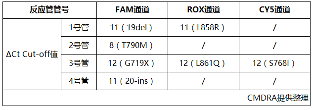 在精密度研究中,申请人采用阴性精密度参考品、弱阳性精密度参考品(1%突变比例)和强阳性精密度参考品(50%突变比例)在3批成品试剂盒(P214072505Z、P214080103Z、P214080504Z)上分别评价了本产品的批内、批间及检测日内、日间和操作者间精密度,结果显示Ct值CV值均在5%以内,表明试剂盒的批内、批间及检测日内、日间和操作者间精密度均较好。 本试剂盒采用91份阳性参考品和12份阴性参考品在3批成品试剂盒(P214072505Z、P214080103Z、P214080504Z)上分别评价了试剂盒的特异性和准确度,阳性和阴性参考品的符合率均为100%。 交叉反应评价中,申请人针对EGFR基因具有同源性、可能引起交叉反应的其它突变基因类型、易引起交叉反应的野生型、与非人类基因及肺相关感染微生物等进行交叉反应评价。所用样本包括HER2基因质粒DNA(103拷贝/μL)、血浆样本DNA(1ng/μL)、细菌/酵母菌/结核分枝杆菌/肺炎链球菌DNA(1ng/μL),经验证,上述样本与本产品均不产生交叉反应。 干扰试验结果显示血浆样本中可能存在的内源性干扰物(血红蛋白、甘油三酯、铁蛋白等,浓度分别为2g/L、37mmol/L和200ng/mL),以及外源性干扰物(紫杉醇、卡铂、特罗凯、柠檬酸钠等,浓度分别为90μg/mL、90μg/mL、90μg/mL和0.645mol/L),均不干扰本试剂盒的检测结果。 针对核酸提取纯化步骤,申请人对比了Qiagen公司的QIAamp Circulating nucleic acid Kit和厦门艾德的核酸提取试剂对81份血浆样本的DNA提取效率,结果显示上述两种方法核酸提取效率相当,提取样本用于本试剂盒检测,性能可满足要求。通过以上评价,选择QIAamp Circulating nucleic acid Kit和厦门艾德的核酸提取试剂作为本产品核酸提取方法。 本次申报产品仅包括1种包装规格(12测试/盒),申请人提供了三批产品(P214072505Z、P214080103Z、P214080504Z)在所有适用机型上的性能评估资料。以上性能研究符合44号公告要求。 (四)阳性判断值研究 本产品用于阳性判定值研究的血浆样本来源于厦门艾德生物技术研究中心有限公司,该样本EGFR突变情况经数字PCR方法验证。 对于临床常见的19-del、L858R和T790M突变类型,申请人均采用了94例临床样本进行检测。使用3批成品试剂盒(P214072505Z、P214080103Z、P214080504Z)在Stratagene Mx3000P™、ABI7500和宏石SLAN系统三种机型上,对提取的DNA进行检测,通过SPSS软件对ROC曲线进行分析,根据Youden指数最大值确定其阳性判定值。 对于20-ins、S768I、G719X、L861Q稀有突变类型,申请人使用3批成品试剂盒(P214072505Z、P214080103Z、P214080504Z)在Stratagene Mx3000P™、ABI7500和宏石SLAN系统三种机型上进行检测,采用与数字PCR平行对比的方法进行阳性判定值的确定,其中用于20-ins分析的临床样本为45例,其它稀有突变样本各50例。 通过上述检测分析,最终确定本产品阳性判断值见表4。 表4 阳性判断值的确定 ΔCt值= Ct值FAM/ROX/CY5 —Ct值HEX/VIC。 (五)稳定性研究 申请人对本产品实时稳定性、热加速稳定性、冻融稳定性、开瓶稳定性进行研究,确定了在各种条件下本产品的有效保存时间。 实时稳定性研究:采用三批次试剂盒(批号:P214111401Z、P214112001Z、P214112602Z)储存于-20±5℃条件下,分别在0、2、4、6、7、8、9和10个月对物理性能、准确度、特异性、检测限和精密度进行考察,各项性能指标均符合要求,确定产品在-20±5℃条件下,可稳定保存8个月。 热加速稳定性研究:将三批次成品试剂盒(批号:P214111401Z、P214112001Z、P214112602Z)解冻后,放置于37℃保存,在第0、3、5、7天对物理性能、准确度、特异性、检测限和精密度进行考察,结果显示,产品在37℃条件下,可稳定保存7天,检测性能均满足要求。 冻融稳定性研究:将三批次成品试剂盒(批号:P214111401Z、P214112001Z、P214112602Z)按照规定条件于-20±5℃存储至完全结冰,再取出置于室温完全解冻,如此反复冻融数次,分别在反复冻融第0、2、4、6、8和10次后对物理性能、准确度、特异性、检测限和精密度进行考察,结果显示,产品反复冻融10次,性能均满足要求。 开瓶稳定性研究:将三批次成品试剂盒(批号:P214111401Z、P214112001Z、P214112602Z)解冻后,拆开包装,将P-EGFR 8联PCR反应条、P-EGFR反应液、P-EGFR混合酶、P-EGFR阳性对照开盖后再盖紧,分别置2~8℃和-20±5℃保存。2~8℃保存的试剂盒在第0、3、5和7天,-20±5℃保存的试剂盒在第0、4、6和8个月对物理性能、准确度、特异性、检测限和精密度进行考察。结果显示,开瓶后的试剂盒在2~8℃保存7天和-20±5℃保存8个月,各项性能指标均满足要求。 三、临床评价摘要 (一)一致性临床研究 申请人在复旦大学附属中山医院、云南省肿瘤医院(昆明医科大学第三附属医院)、温州医科大学附属第一医院、上海市胸科医院、北京协和医院和首都医科大学附属北京胸科医院共6家机构完成了临床试验。采用考核试剂与已上市产品对临床样本进行比较研究试验的方法验证本产品的临床性能。入组样本为晚期(IIIB-IV期)肺腺癌和少量非肺腺癌、肺腺癌IA-IIIA期的血浆样本,共计1069例。对比试剂选择已上市同类产品人类EGFR基因突变检测试剂盒(荧光PCR法)(注册证号:国械注准20143402001)。考核试剂与对比试剂检测结果不一致的样本或两种试剂检测均为阳性且不能具体分型的样本,采用高通量测序方法(NGS)进行序列测定。 本临床试验共检测出373例突变阳性样本,阳性率为34.89%,包括168例19del突变阳性、168例L858R突变阳性、69例T790M突变阳性、11例20-ins突变阳性、14例G719X