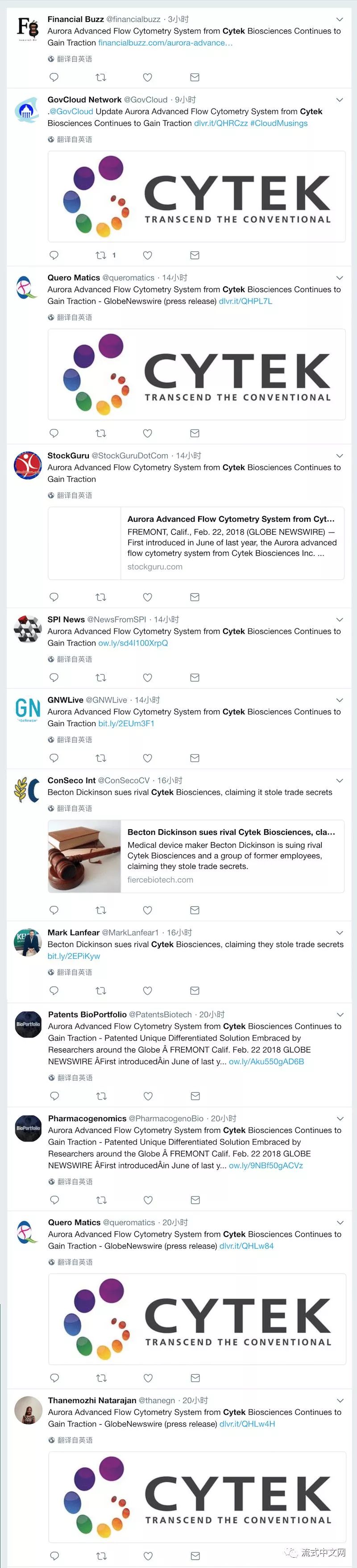 据流式中文网公众号发布的文章《一周前BD起诉Cytek窃取其商业机密,今日国外社交媒体Cytek仪器新闻刷屏》表示,今日在推×特上看到几个新闻媒体(多的关注者有数万,少的有数千),陆陆续续在给Cytek的Aurora流式细胞仪做宣传。 原来被行业巨头告了还可以这么玩……