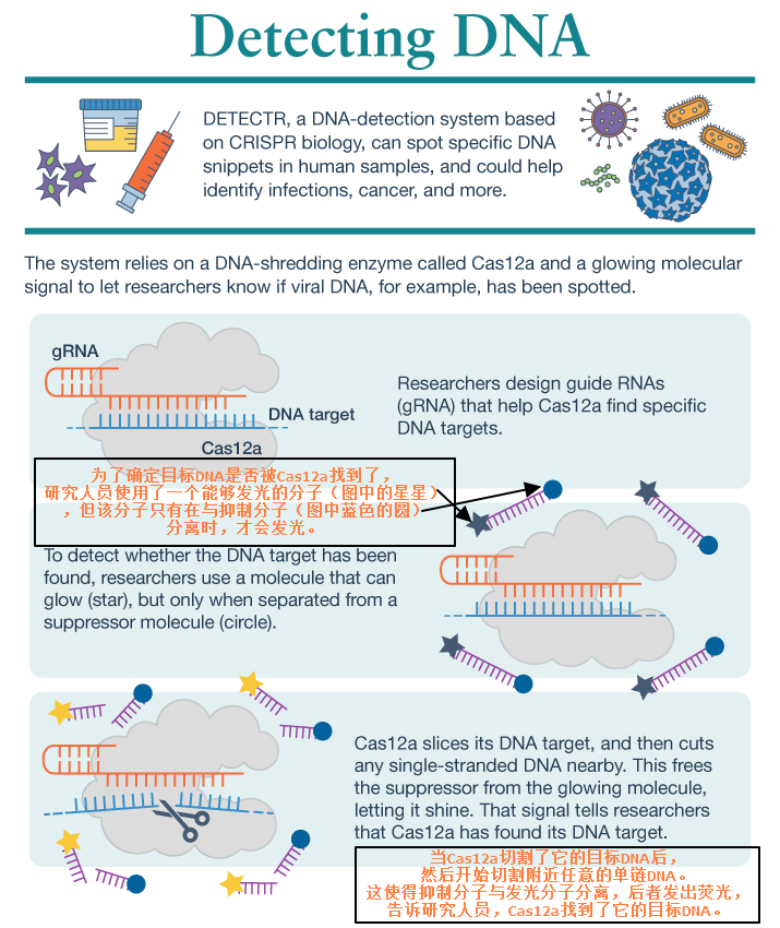 Infographic by the Howard Hughes Medical Institute 具体来说,DETECTR是在一个单一反应中添加所有试剂,包括CRISPR-Cas12a和它的向导RNA、荧光报告分子以及一种叫做RPA(recombinase polymerase amplification,类似于PCR)的等温扩增系统。当加热到体温时,RPA会快速增加目标DNA的拷贝数,使Cas12a更容易找到并切割它,然后任意切割附近单链DNA,从而让报告分子发出荧光(具体发光机制见上图)。