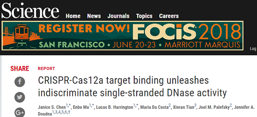Doudna教授说:“现在,我们仍着迷于细菌CRISPR系统的功能,以及如何借助对相关机制的理解来产生新的技术。” 此次,双方于同日在Science发表新成果,不管是杂志刻意安排,还是一种巧合,都再次证实了CRISPR酶用于核酸检测的实力。或许,除了基因编辑,CRISPR还能带给我们带来更多、更大的惊喜! 参考资料: |