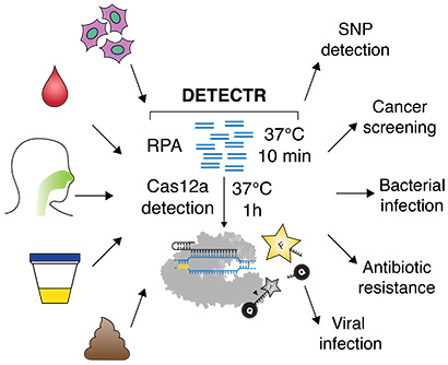 图片来源:Science(DOI: 10.1126/science.aar6245) 快速、简便的诊断系统——DETECTR 基于这一思路,Doudna教授团队开发出一种被称为“DETECTR”(DNA Endonuclease Targeted CRISPR Trans Reporter)的诊断系统,可用于对临床样本中的少量DNA进行快速、简便地即时检测。相关成果以“CRISPR-Cas12a target binding unleashes indiscriminate single-stranded DNase activity”为题发表在Science杂志上。