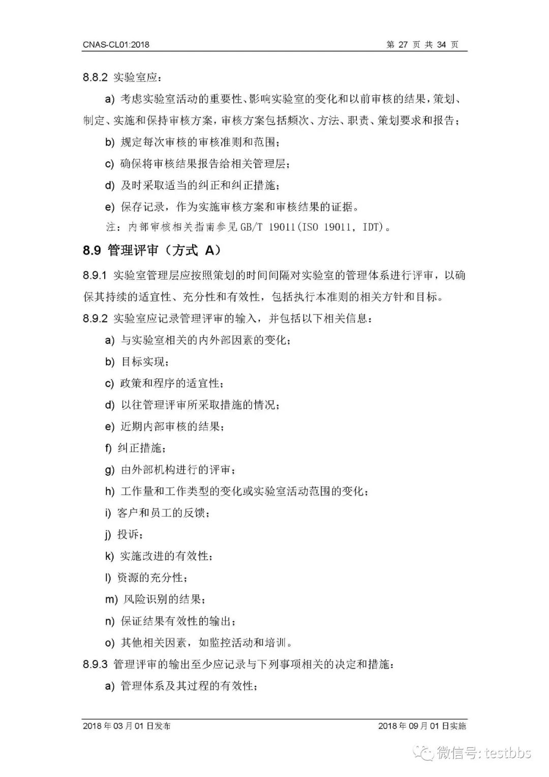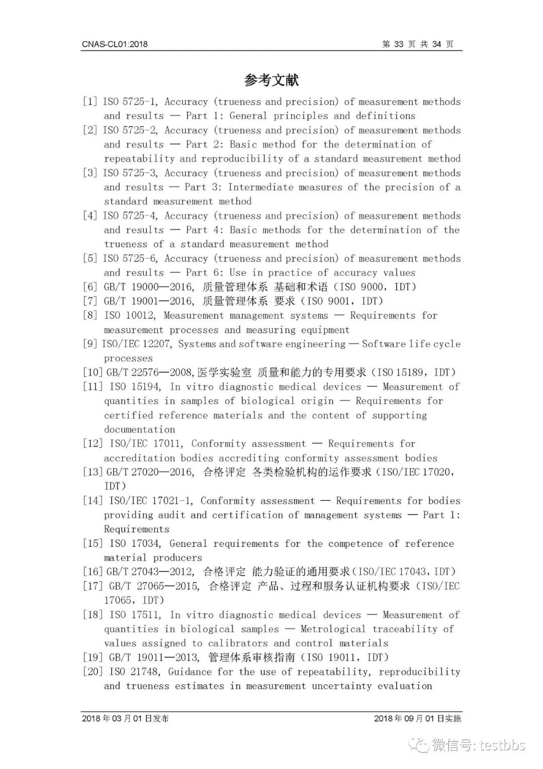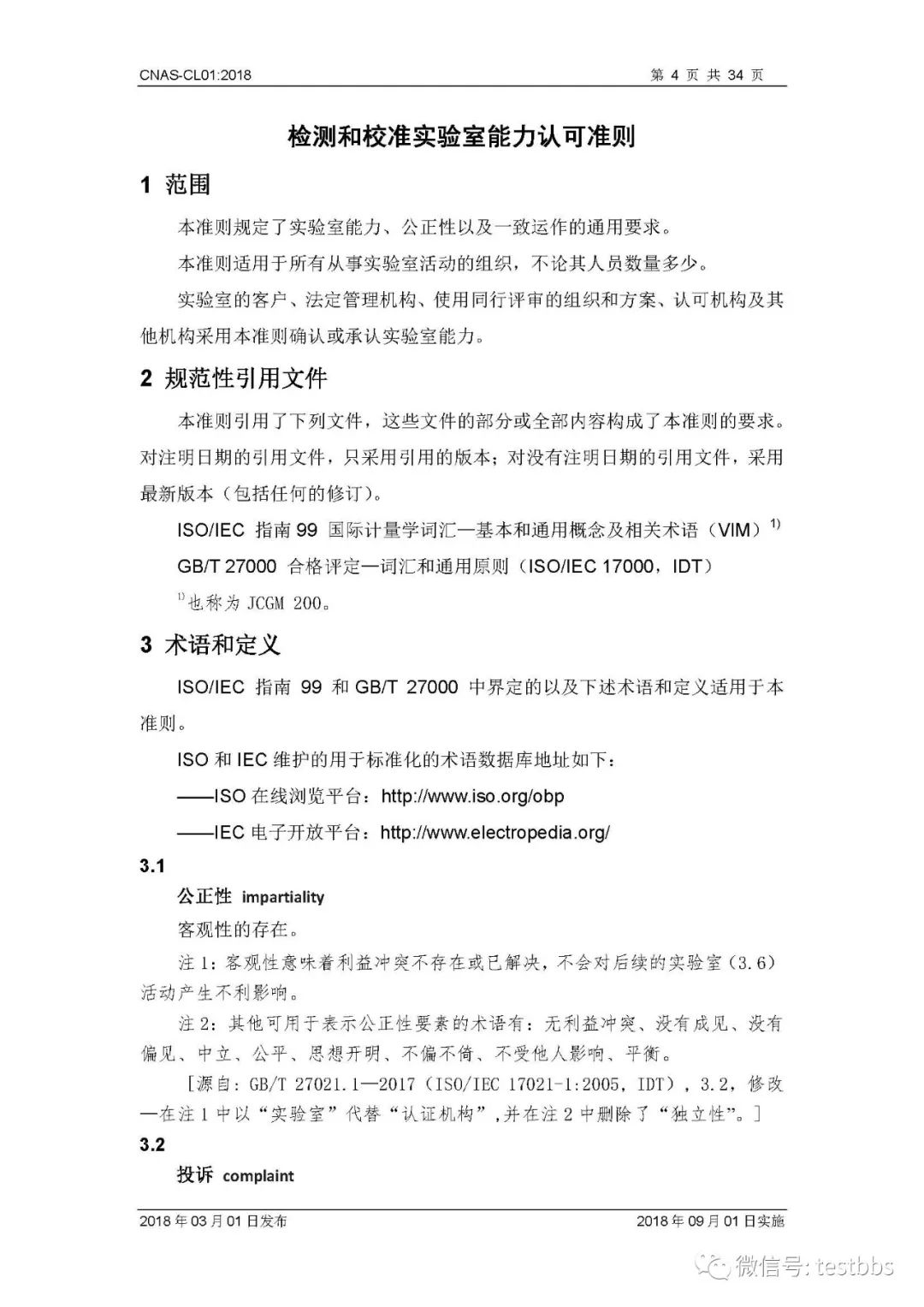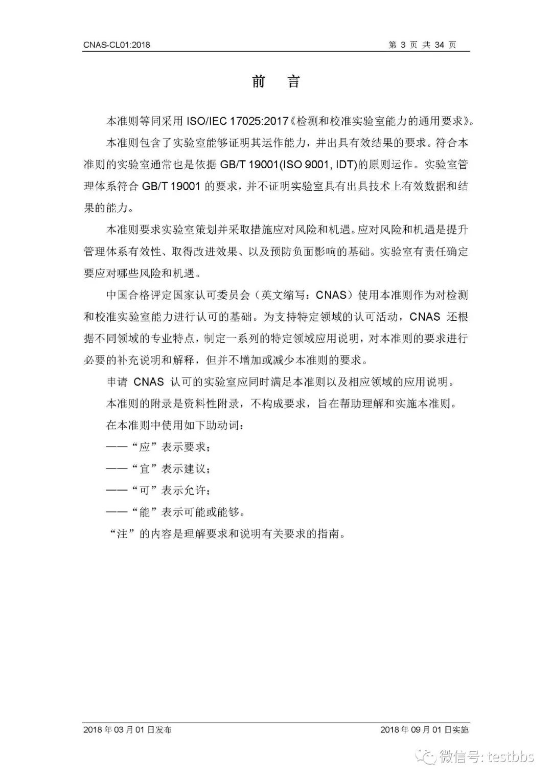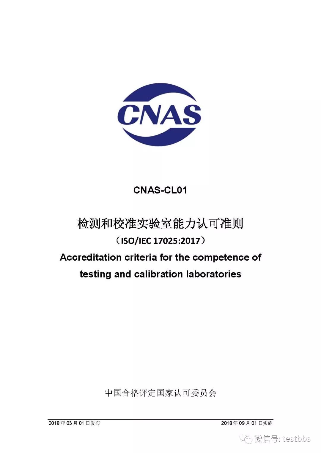 CNAS-CL01:2018 《检测和校准实验室能力认可准则》 3月1日CNAS官网发布了最终版的CNAS-CL01:2018《检测和校准实验室能力认可准则》,将于2018年09月01日实施。我们第一时间予以转发发布~ 原文链接地址: https://www.cnas.org.cn/rkgf/sysrk/jbzz/2018/03/889065.shtml