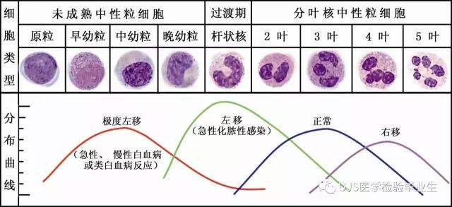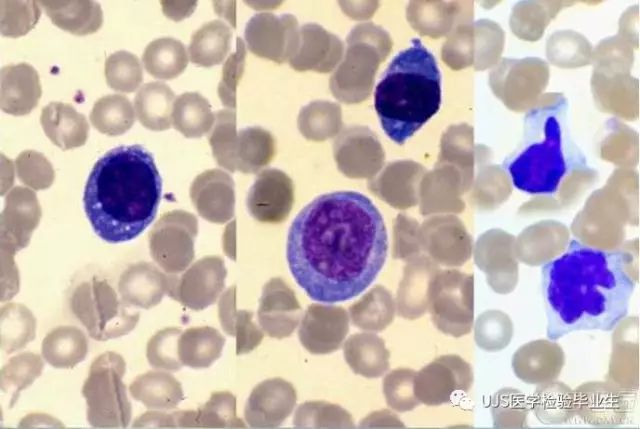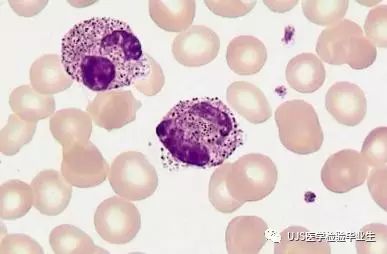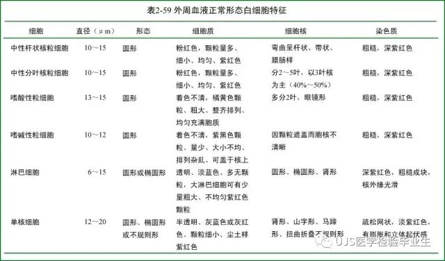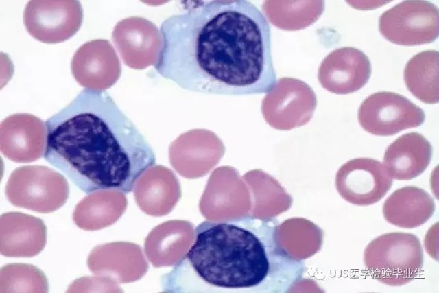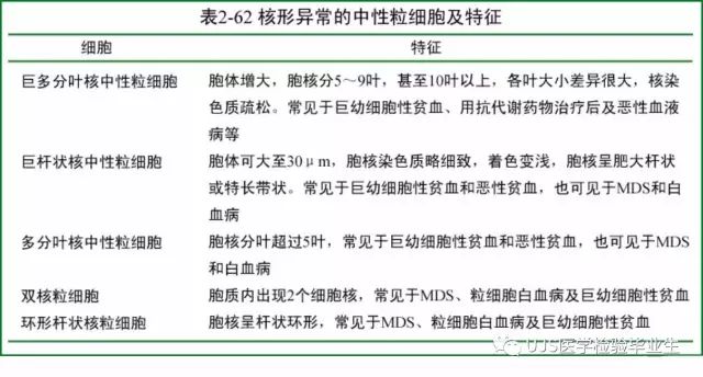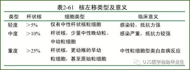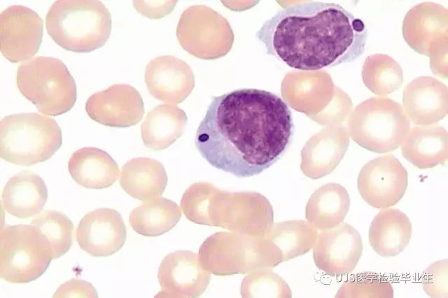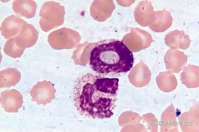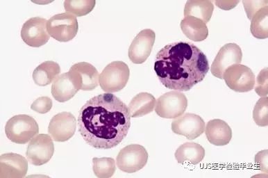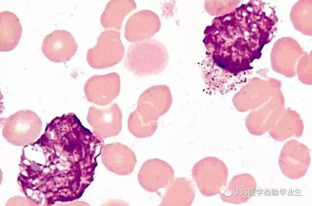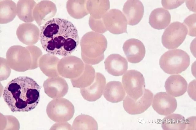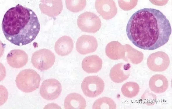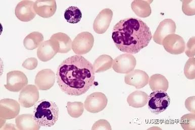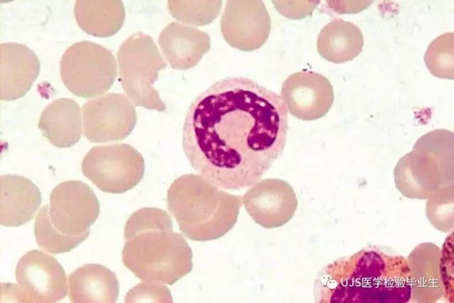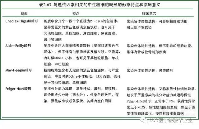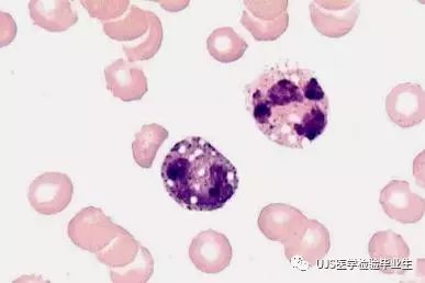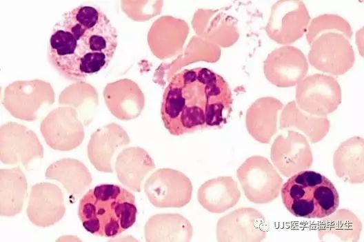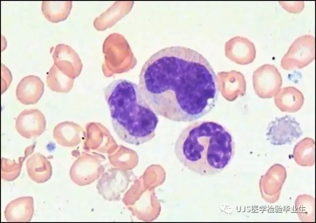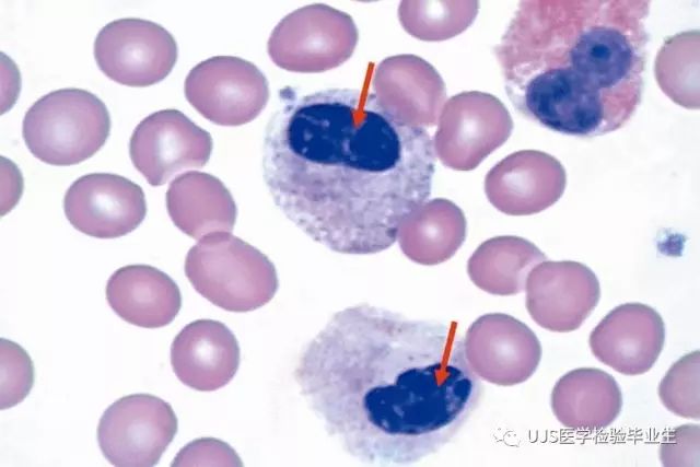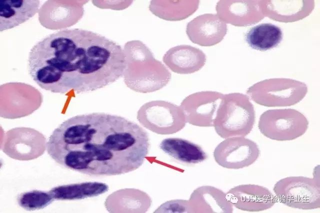 说明: 一、没有制备/染色良好的血涂片,准确的形态学检验结果根本无从谈起; 关于血涂片的制备/染色,请参考以下两文: 二、本文采用的并非ICSH新的命名特征与分级标准; 想看新版本,可点击“阅读原文”,或者戳以下链接: 白细胞形态学检查主要采用显微镜法;现代自动图像分析仪和血液分析仪还未能取代显微镜;血液分析仪对异常结果作出报警后,仍需要采用显微镜法检查血涂片进行复查,以提供更加确切的细胞形态学检查结果。 一、正常形态白细胞 1.外周血液正常形态白细胞特征 正常形态白细胞特征如下表: 下图中的白细胞分别为 ①:单核细胞 ②:嗜碱性粒细胞 ③:嗜酸性(分叶核)粒细胞 ④:(嗜)中性杆状核粒细胞 ⑤:(小)淋巴细胞 ⑥:(嗜)中性分叶粒细胞、 【笔者注】查看更多外周血正常白细胞的图片,可访问下列两文: 2.中性粒细胞核形界定 凡胞核完全分离或核间以一丝(只有核膜而无染色质)相连者为分叶核粒细胞(如下图); 细胞核径最窄处小于最宽处1/3者为分叶核粒细胞,大于1/3者为杆状核粒细胞;若两丝相连者则为杆状核粒细胞(如下图)。 当中性粒细胞杆状核与分叶核难以鉴别时,可将其归类于分叶核。 3.粒细胞胞质内颗粒 中性粒细胞胞质内的颗粒分为嗜天青颗粒(占20%)和特殊颗粒(占80%),其比较见表2-60。 二、中性粒细胞异常形态 1.毒性变化 在严重的化脓性感染、败血症、恶性肿瘤、急性中毒、大面积烧伤等病理情况下,中性粒细胞可发生多种形态改变。 下图中可见中性粒细胞大小不均: 下图中可见中毒颗粒: 下图中可见空泡形成: 下图中可见杜勒小体: 下图为退行性变等 这些形态变化对观察病情变化和判断预后有一定意义。 2.中性粒细胞的核象变化 核象标志着中性粒细胞从新生细胞至衰老细胞的发育阶段。正常情况下,外周血液中性粒细胞以分叶核为主,胞核常分为2~5叶,杆状核较少。病理情况下,中性粒细胞的核象可发生核左移或核右移。 (1)核左移 外周血液的中性杆状核粒细胞增多或(和)出现晚幼粒细胞、中幼粒细胞,甚至原始/早幼粒细胞的现象,称为核左移。 下图中,杆状核粒细胞增多(正常情况下,中性杆状核粒细胞与中性分叶核粒细胞之比约为1:13): 下图中出现了中性中幼/晚幼粒细胞: 下图中出现了早幼粒细胞(最左): 核左移常见于一些良性疾病,如化脓性感染、急性溶血以及应用细胞因子等,常伴有中毒颗粒、空泡形成、退行性变等毒性变化。核左移多伴有白细胞总数增高,但也可正常甚至减少。 ①再生性核左移:核左移伴白细胞总数增高称为再生性核左移,提示骨髓造血功能和释放能力旺盛,机体抵抗力强等。 ②退行性核左移:核左移伴白细胞总数正常或减少称为退行性核左移,提示骨髓释放功能受到抑制,机体抵抗力差。 核左移分为轻、中、重度三级,与感染的严重程度和机体的抵抗力密切相关(表2-61)。 然而核左移也可见于一些恶性疾病,如急性/慢性粒细胞白血病。 下图为慢性粒细胞白血病,可见一个早幼粒细胞和三个中幼粒细胞: (2)核右移 外周血液的中性分叶核粒细胞增多,并且5叶核以上的中性粒细胞>3%时称为核右移(如下图,正中细胞胞核分为六叶)。 严重核右移常伴有白细胞总数减少,提示骨髓造血功能衰退,与缺乏造血物质、DNA合成障碍和骨髓造血功能减退有关。 核右移常见于巨幼细胞性贫血、内因子缺乏所致的恶性贫血(其实是巨幼细胞性贫血的一种特殊情况)、感染、尿毒症、MDS等,应用抗代谢药物治疗肿瘤时也会出现核右移(会影响叶酸的利用,类似于巨幼细胞性贫血)。 3.中性粒细胞胞核异常形态 下图中可见巨多分叶核中性粒细胞: 下图中可见巨杆状核中性粒细胞(其下方还有一个巨晚幼粒细胞): 下图中可见多分叶核中性粒细胞: 下图中可见双核粒细胞: 下图中可见环形杆状核粒细胞: 4.与遗传因素相关的中性粒细胞畸形 下图为Chediak-Higashi畸形: 下图为Alder-Reilly畸形: 下图为May-Hegglin畸形: 下图为Pelger-Hüet畸形: 5.棒状小体 白细胞胞质中出现的紫红色细杆状物质,1个或数个,长约1~6μm,称为棒状小体(如下图): 出现数个棒状小体,呈束状排列(柴束状)的白细胞称为柴捆细胞(faggot细胞),如下图: 下图中也是柴捆细胞,来自@王霄霞_血液学检验教师 新浪微博: 棒状小体的出现情况:急性粒细胞白血病(多见)、急性单核细胞白血病(少见)、急性淋巴细胞白血病则无。 6.中性粒细胞异常形态新的分类(表2-64) 三、淋巴细胞异常形态 1.异型淋巴细胞 在病毒(如腺病毒、人类疱疹病毒等)、原虫(如弓形虫)感染,药物反应、结缔组织疾病、应激状态或过敏原等因素刺激下,淋巴细胞增生并发生形态上的变化,表现为胞体增大、胞质增多、嗜碱性增强、细胞核母细胞化,称为异型淋巴细胞或反应性淋巴细胞。异型淋巴细胞的形态特点见表2-65。 下图为Ⅰ型异型淋巴细胞(左上角),又称泡沫型或浆细胞型: 下图为Ⅱ型异型淋巴细胞,又称单核细胞型: 下图为Ⅲ型异型淋巴细胞(右侧),又称未成熟细胞型或幼淋巴细胞型: 下图中从左到右,依次为异型淋巴细胞Ⅰ型,Ⅲ型,Ⅱ型 2.卫星核淋巴细胞 淋巴细胞主核旁有1个游离的卫星小核称为卫星核淋巴细胞。因染色体损伤,丧失着丝点的染色单体或其片段在有丝分裂末期,未进入子代细胞遗传物质体系内而形成。 常见于接受较大剂量电离辐射、核辐射之后,或其他理化因素、抗癌药物等造成的
