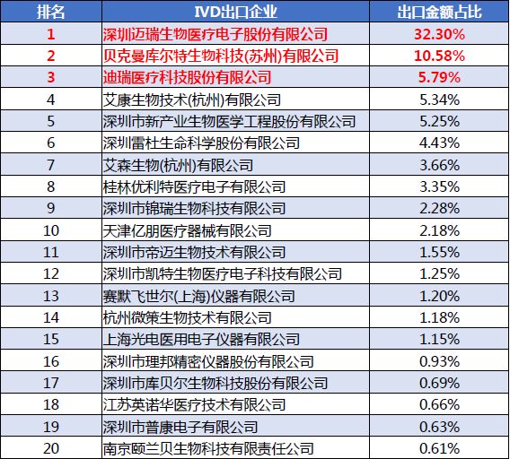 分析定义 数据来源:海关统计WISMAR医疗器械海外代理商查询系统 数据维度: IVD设备整机出口常用海关编码 90278099 90275000 名词定义: POCT( 根据产品名及仪器临床诊断时间及环境 ) 分析范畴 不含内容:本报告涉及数据包试 剂(盒)、试纸及覆于衬背配件 统计时间:为截至海关结日期2017年12月31日 误差原因:企业内部销售数据统计时间节点误差;合同结款时委托物流及同行业间代理销售误差;细分产品企业总销售额误差;国家统计微调整机、零配件、试剂销售误差。 分析方法 排名方法:贸易式为一般,FOB 美元总金额占比排名 TOP10 (不含来料加工及保税其他贸易方式) 产品归类:按申报名称行业惯例区分法类 进口国:申报目的国(不含转运国) 01 IVD整机总出口规模简析 根据大连维斯马医疗器械研究中心统计 2017年(不含试剂 )共向173个国家和地区出口,2017 年出口总额高达 5.77亿美金。 IVD整机中国2017累计1-12月 出口国TOP20格局图 02 IVD整机进口国市场规模 2017年1-12月IVD仪器出口额占比前五。中国香港 41.29%、美国 14.77%、德国 5.18%、印度5.15%、日本3.64%。其中香港为转口贸易,主要有香港离岸公司进口拉高占比。 图示金额:万美元 03 POCT与IVD整机出口概况 2017年大连维斯马医疗器械研究中心根据设备检验环境划分。 POCT( 床边检验 )出口总额 26572 万美金,POCT 占总IVD设备出口 46.02%。 POCT占总IVD整机出口比例 04 POCT与检验中心设备出口概况 2017 年1-12 月大连维斯马医疗器械研究中心根据细分领域统计血糖类检验仪器出口额: 25352.83万美元居首,血球出口额:10445.45万美元位居第二,生化检验设备以8255.34万。 TOP20 IVD设备企业2017年1-12月出口 TOP 20 POCT企业2017年1-12月出口 05 检验中心设备分类企业出口 2017年1-12月市场份额 2017年1-12月血球类检验产品共计出口约7019.95万美金。 2017年1-12月生化类检验产品共计出口约5789.92万美金。 2017年1-12月尿液类检验产品共计出口约1082.79万美金。 2017年1-12月免疫类检验产品共计出口约为2650.83万美金。 06 检验中心设备分类 2017年1-12月出口国概况 07 中国IVD行业2017年产业格局图 IVD产业中国去也分布格局图 2017年1-12月全国经营IVD设备出口企业共计668家。广东、上海、江苏为IVD出口前三大省。其中广东省占据出口企业总规模22.31%。 08 IVD产业各省出口贡献比例图 原创文章,仅代表作者本人观点,不代表麦科田医疗的立场,转载请注明来源及作者。 数据来源:www.wsminfo.com 制表单位:大连维斯马 |