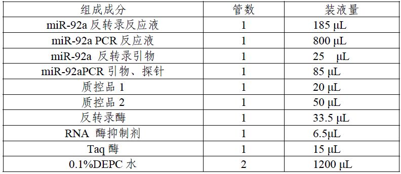 医疗器械产品注册 技术审评报告 (境内) 产品中文名称:miR-92a 检测试剂盒(荧光RT-PCR 法) 产品管理类别:三类 申请人名称:深圳市晋百慧生物有限公司 国家食品药品监督管理总局 医疗器械技术审评中心 基本信息 一、申请人名称 深圳市晋百慧生物有限公司 二、申请人住所 深圳市南山区桃源街道田寮工业A 区9 栋二楼西面 三、生产地址 深圳市南山区桃源街道田寮工业A 区9 栋二楼西面 深圳市南山区桃源街道田寮工业A 区田寮大厦1503 产品审评摘要 一、产品概述 (一)产品主要组成成分 该产品配套使用的核酸提取试剂为深圳市晋百慧生物有限公司生产的核酸提取试剂, 备案号为: 粤深械备20150228 号。 (二)产品预期用途 该产品用于体外定性检测人粪便样本中的miR-92a 核酸。 该产品用于便潜血阳性、综合其他症状如排便习惯改变、大便形状变化、慢性便秘、排便里急后重等经临床医生诊断建议肠镜检查同时由于不同原因拒绝进行肠镜检查的患者,用于临床对大肠癌的辅助诊断。检测结果阳性不作为大肠癌早期诊断或确诊的证据,检测结果阴性也不能排除大组成成分管数装液量肠癌的可能,患者最终诊断应依据肠镜检查结果。该产品不用于普通人群的肿瘤筛查。 大肠癌按《恶性肿瘤TNM 分类法》分为0 期,I 期,II期,III 期,IV 期,早期一般呈现如排便习惯改变、大便形状变化、大便带血、慢性便秘、排便里急后重等症状,但常因症状轻微和不典型而被忽视。miR-92a 来自人类13 号染色体上的miR-17-92 基因簇,是一类小分子非编码RNA。miR-92a 通过靶向抑制PTEN、KLF4 和下游的p21 基因,可促进大肠癌细胞的增殖和迁移。研究发现,在大肠癌患者粪便样本中miR-92a 含量特征性增高。 (三)产品包装规格 48 人份/盒 (四)产品检验原理 miR-92a 检测试剂盒(荧光RT-PCR 法)是采用RNA 提取试剂盒提取粪便中的RNA,进行RT-PCR 反应,反应中的引物、探针能够与miR-92a 反转录产物特异性结合并进行PCR 扩增,在扩增过程中探针与含miR-92a 模板的反转录cDNA 链互补结合后,探针5’端荧光染料基团被Taq 酶切下并释放荧光信号,被检测到的荧光信号强弱可以反映样本中miR-92a 的含量。 二、临床前研究摘要 (一)主要原材料 1.主要原材料的种类 该试剂盒主要原材料包括:Taq 酶、反转录酶、miR-92a反转录引物、miR-92a 上游引物、miR-92a 下游引物、miR-92a探针、miR-92a 基因RNA 片段、dNTP、RNA 酶抑制剂。 2.主要原材料的选择 2.1 外购的主要原材料包括:Taq 酶、反转录酶、dNTP、RNA 酶抑制剂。通过使用各成分配制反应体系,以大肠癌阳性粪便样本进行功能性试验,筛选最佳供应商。 2.2 自行设计的主要原材料包括:miR-92a 反转录引物、miR-92a 上游引物、miR-92a 下游引物、miR-92a 探针、miR-92a基因RNA 片段。通过功能性试验进行确认。 申请人设计了完整的企业参考品,包括阳性参考品、阴性参考品、检测限参考品、精密度参考品、线性范围参考品、干扰物质参考品。阴性参考品包括肠癌阴性粪便样本、食道癌患者粪便样本、胃癌患者粪便样本;阳性参考品、精密度参考品、干扰物质参考品采用大肠癌粪便样本;检测限参考品、线性范围参考品采用合成的miR-92a 基因RNA 片段稀释配制而成, 检测限参考品浓度为1×104copies/μL 的miR-92a 基因RNA 片段, 线性范围参考品浓度为1×107copies/μL 的miR-92a 基因RNA 片段。各项企业参考品综合用于产品检测灵敏度、特异性和重复性评价。试剂盒内质控品包括质控品1 和质控品2,质控品1 含有miR-92a 基因RNA 片段,质控品2 为0.1%DEPC 水,用于检测过程中的质量控制 (二)生产工艺及反应体系研究 1. 反转录 申请人对PCR 反应体系中各主要原料(反转录酶、反转录引物、RNA 酶抑制剂、dNTP、MgCl2、PCR 反应缓冲液)的浓度及用量,以及反转录程序进行优化试验,确定了最佳的反转录试剂的生产工艺及反应体系。 2.荧光PCR 扩增 申请人对PCR 反应体系中各主要原料(Taq 酶、MgCl2、dNTP、引物、探针、PCR 反应缓冲液、50% 甘油)的浓度及用量以及PCR 反应程序进行优化试验,确定了最佳的荧光PCR 扩增试剂的生产工艺及反应体系。 3.申请人也对RNA 浓度、反转录模板量、PCR 模板量、粪便样本量、样本采集方法进行了研究,进一步确定了试剂盒反应体系的各项参数和指标。 (三)分析性能评估 该产品分析性能包括检测限、阴性符合率、阳性符合率、精密度、干扰物质、线性范围等。 最低检测限评估中,申请人采用高浓度miR-92a 阳性参考品梯度稀释于提取的不含miR-92a 基因的粪便样本中,分别进行25 次重复检测,得到检出率为95%的浓度水平为100copies/μL 作为本试剂的最低检测限。阳性符合率评估中,申请人采用临床确诊为大肠癌早期患者、大肠癌中期患者、大肠癌晚期患者粪便样本各5 份来进行检测,检测结果显示阳性符合率达到100%。在精密度研究中,申请人采用晚期和中期大肠癌患者粪便样本,评价了本产品批内及批间精密度,结果显示三批试剂的批内和批间检测Ct 值CV%均不高于5%。 阴性符合率评价中,申请人针对miR-92a 基因与其他同源基因和miR-92a 阴性样本非特异反应进行评价,样本包括食道癌患者粪便样本、胃癌患者粪便样本、息肉患者粪便样本、腺瘤患者粪便样本、胃炎患者粪便样本、肠炎患者粪便样本、阑尾炎患者粪便样本、结肠炎患者粪便样本、消化性溃疡患者粪便样本、肝癌患者粪便样本、胰腺癌患者
