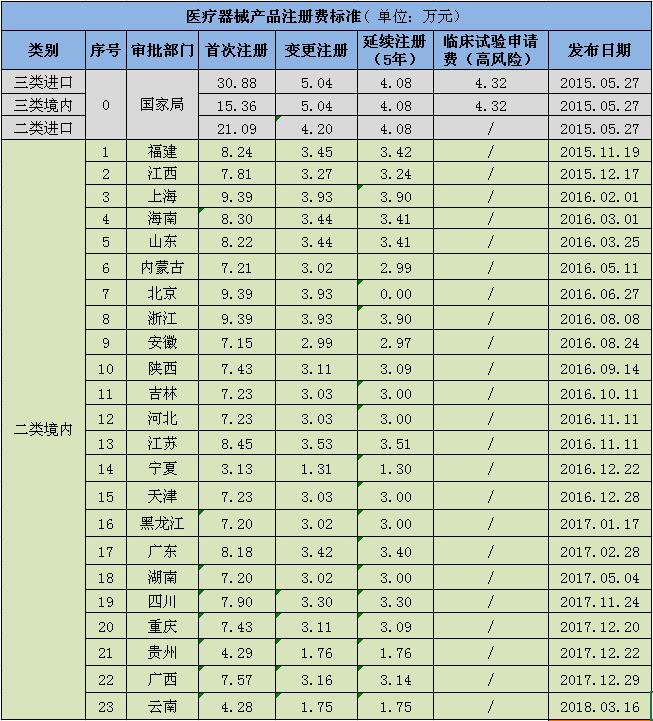 注:1.医疗器械产品注册收费按《医疗器械注册管理办法》、《体外诊断试剂注册管理办法》确定的注册单元计收。 2.《医疗器械注册管理办法》、《体外诊断试剂注册管理办法》中属于登记事项变更申请,不收取变更注册申请费。 截至目前,我国共有23个省(直辖市、自治区)出台医疗器械产品注册费收费标准。 | |||||||||||||||||||||