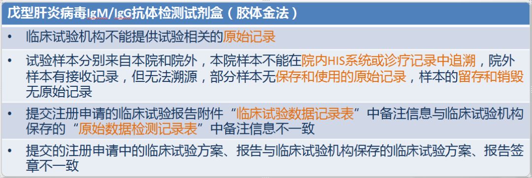 国家局发布对体外诊断试剂不予注册的公告中,都详细描述了试验数据不能溯源、研究报告中描述的样本病种与实际不符等问题,这些曝光的典型问题将成为监管部门严查的对象。