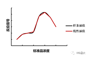 定量体外诊断试剂盒,测定未知样本待测物的浓度含量,是以系列浓度标准品测得剂量反应曲线,即得到标准曲线,再以此计算待测样本的浓度。 当我们得到一系列已知浓度标准品的反应后,就会去建立函数关系,数学上称曲线拟合,根据试剂反应信号趋势的不同会用到不同拟合方式。 反应中待测物质和免疫反应之间的关系一般不是简单的直线,这就存在系列浓度标准品与检测结果有多种曲线拟合方式。不同类型的试剂由于待测物不同、检测方法不同等,试剂反应信号趋势并不相同。建立标准曲线,选择合适的数学模型(函数),提高剂量反应曲线绘制的准确度,从而获得较为精确的待测物浓度结果。一般单纯的线性回归不能说明真实的免疫反应情况,因此标准曲线主要是非线性拟合。 一般采用差值法(内插法)或者曲线拟合的方式获得标准曲线。 差值法(Interpolation Method):用函数f (x)在某区间中已知的若干点的函数值,作出适当的特定函数,在区间的其他点上用这特定函数的值作为函数f (x)的近似值。该方法以假定数据正确为前提,要求以某种方法描述数据点之间所发生关系或规律。即插值是找到一个或几个分片光滑的连续曲面来穿过这些点。 曲线拟合(Curve Fitting):用连续曲线近似地刻画或比拟平面上离散数据点所表示的坐标之间的函数关系的一种数据处理方法。将测得许多离散的实验数据(比如标准品浓度与测定信号值),寻找一条连续光滑曲线来近似反映已知数据组间存在的某种关系的一般趋势,所得近似函数f(x)可以很好地逼近离散数据,这个函数逼近的过程称为曲线拟合。这条光滑曲线,能最佳地拟合数据,通常不必要经过所有数据点,甚至可能不经过任何数据点,曲线拟合公式反映的是数据点整体的变化趋势。 拟合与差值的比较 运算过程上的区别: 拟合:将数据点用最恰当的曲线描述出来,反映问题的规律和趋势,是从特殊到一般。 插值:在知道曲线的形状后,得出某些具体点的性质的过程,是从一般到特殊。 求解误差上的区别: 拟合:在误差不可避免时考虑观察点的误差,以偏差的某种最小为拟合标准。 插值:在观测点处无误差。 常用的数学函数举例 一、插值法: 插值法又可分为线性插值法和样条插值法。 1. 线性插值法(Linear interpolation): 线性插值法是指使用连接两个已知量的直线来确定在这两个已知量之间的一个未知量的值的方法。 最简单的例子:假设我们已知坐标(x0,y0)与(x1,y1),要得到[x0,x1]区间内某一位置x在直线上的值。根据图中所示,我们得到两点式直线方程: