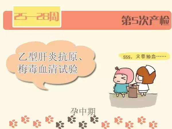 | | 25-28周 | 第5次产检 乙型肝炎抗原 梅毒血清试验 艾滋病抗体 |