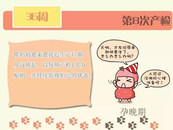 从36周开始,准妈妈愈来愈接近生产日期,此时所做的产检,以每周检查一次为原则,并持续监视胎儿的状态。此阶段的准妈妈,可开始准备一些入院用的东西,以免生产当天太过匆忙,变得手忙脚乱。