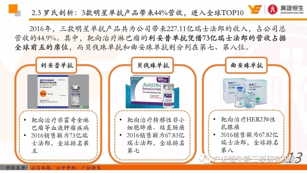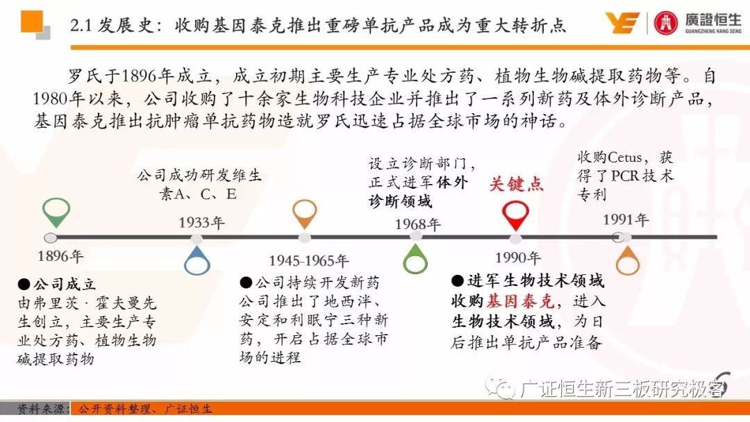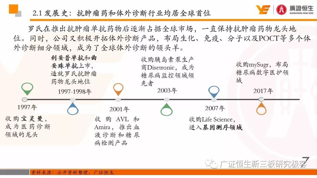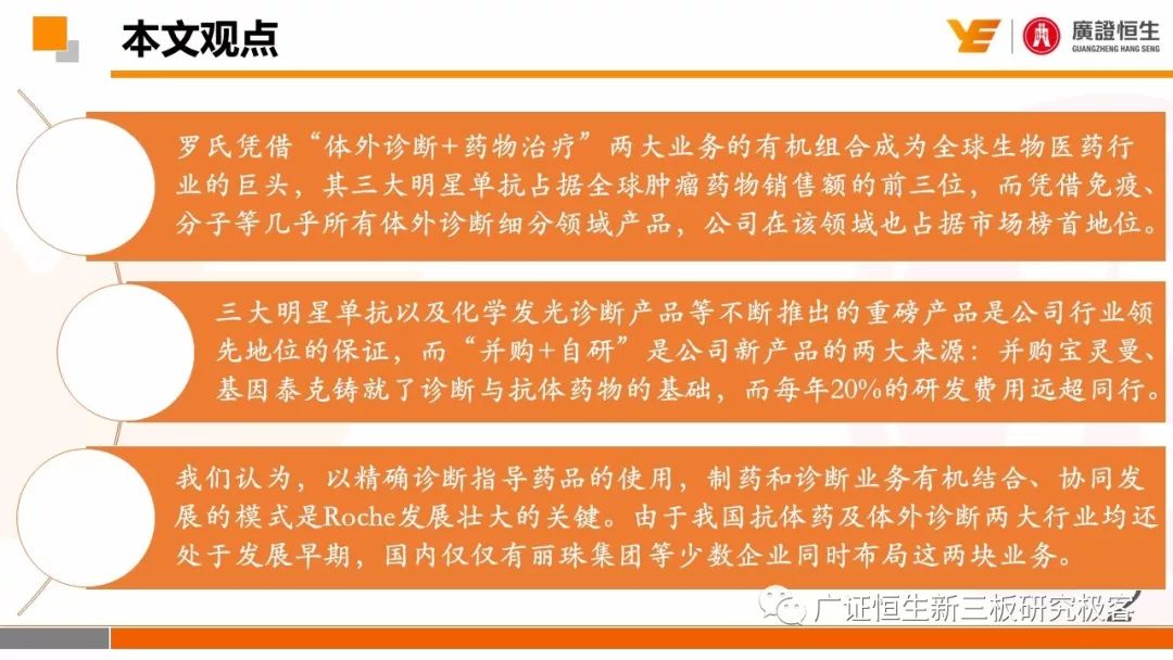 本文观点: 1. 罗氏凭借“体外诊断+药物治疗”两大业务的有机组合成为全球生物医药行业的巨头,其三大明星单抗占据全球肿瘤药物销售额的前三位,而凭借免疫、分子等几乎所有体外诊断细分领域产品,公司在该领域也占据市场榜首地位。