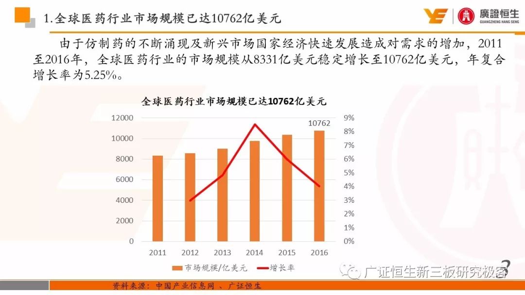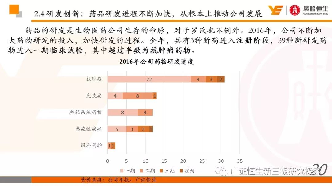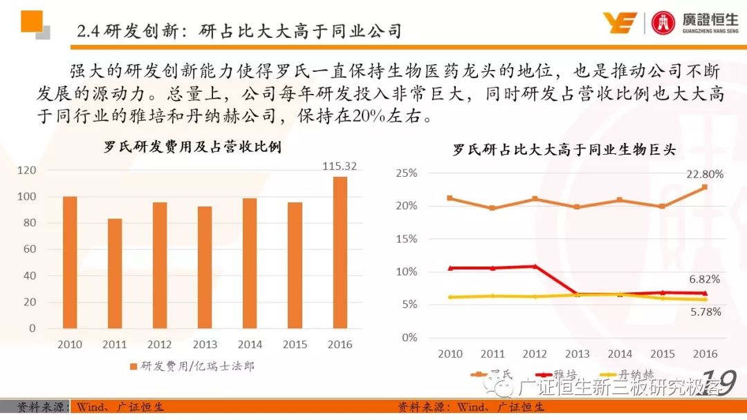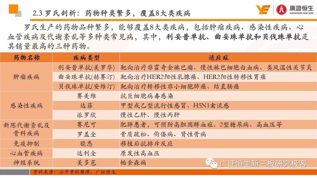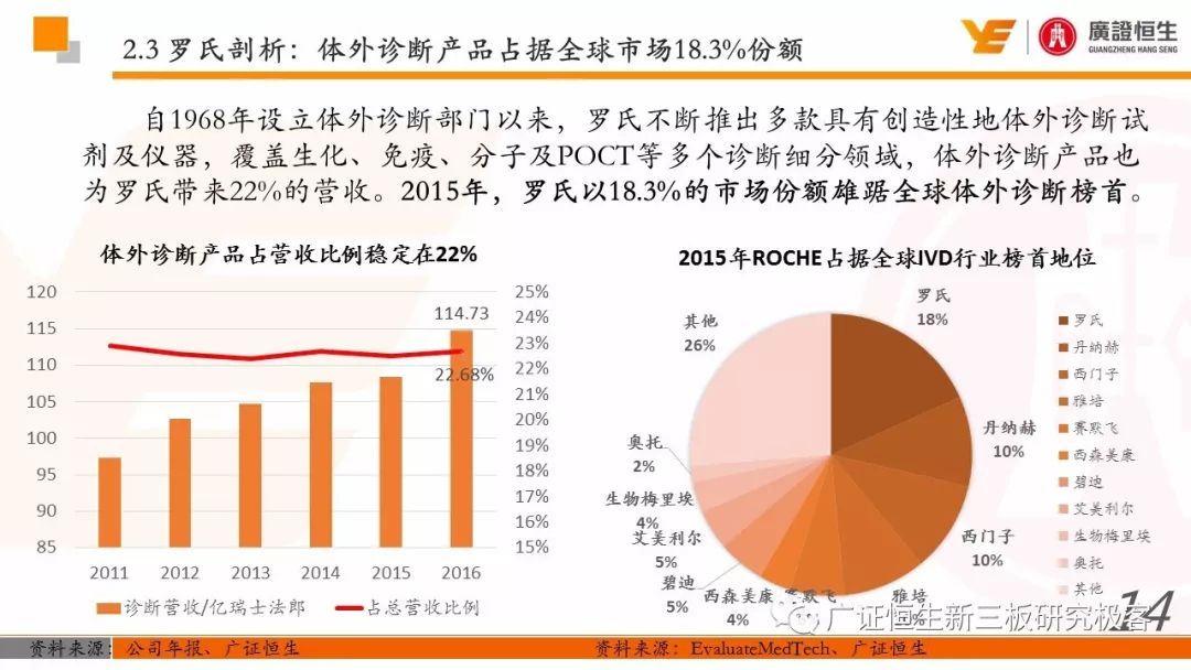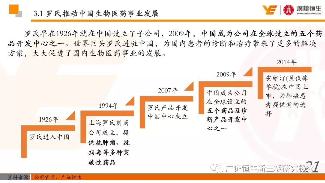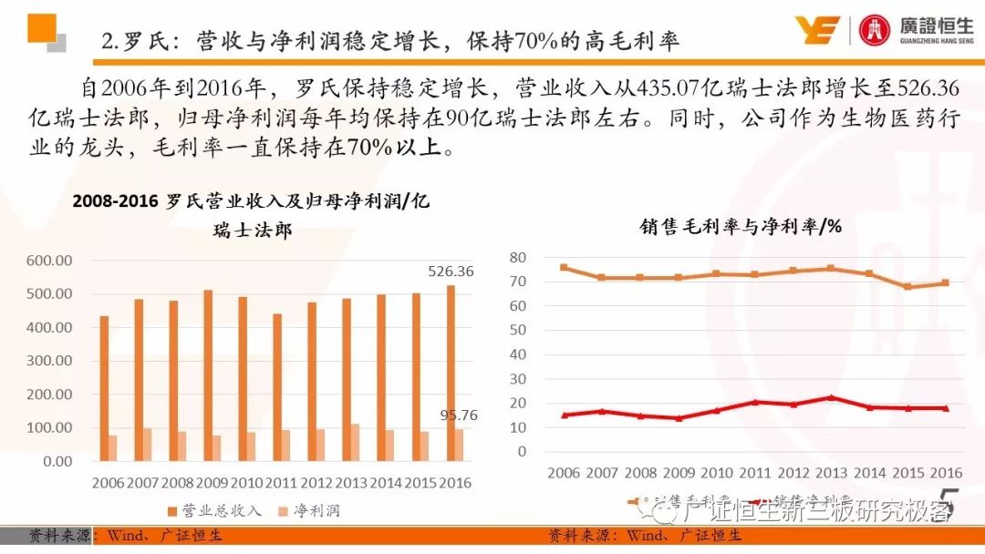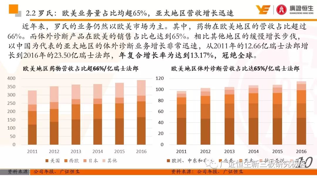 3.以精确诊断指导药品的使用,制药和诊断业务有机结合、协同发展的模式是Roche发展壮大的关键。由于我国抗体药及体外诊断两大行业均还处于发展早期,国内仅仅有丽珠集团等少数企业同时布局这两块业务。 一、全球医药行业市场规模已达10762亿美元 由于仿制药的不断涌现及新兴市场国家经济快速发展造成对需求的增加,2011至2016年,全球医药行业的市场规模从8331亿美元稳定增长至10762亿美元,年复合增长率为5.25%。 二、罗氏:市占率达24%的生物医药行业龙头 罗氏是全球生物医药行业的巨头,总市值达到1521.05亿美元。2015年,公司单克隆抗体产品占全球抗肿瘤药物市场份额的24.65%,三种明星单抗产品占据抗肿瘤药物前三席位;体外诊断产品占全球市场份额的18.3%,在全球抗肿瘤和体外诊断领域均占据优势地位,其客户遍布全球各大医疗机构、科研院所、生物技术及其他主要机构。 自2006年到2016年,罗氏保持稳定增长,营业收入从435.07亿瑞士法郎增长至526.36亿瑞士法郎,归母净利润每年均保持在90亿瑞士法郎左右。同时,公司作为生物医药行业的龙头,毛利率一直保持在70%以上。 罗氏于1896年成立,成立初期主要生产专业处方药、植物生物碱提取药物等。自1980年以来,公司收购了十余家生物科技企业并推出了一系列新药及体外诊断产品。 1968年,公司设立诊断部门,正式进军体外诊断领域;1990年,公司收购基因泰克并在1997年收购宝灵曼,推动公司成为体外诊断领域的先导者;同年,公司推出重磅抗肿瘤药物利妥昔单抗和曲妥珠单抗,开启罗氏抗肿瘤药物龙头地位;2003年,收购胰岛素泵生产商Disetronic,配合公司的便携式血糖仪使公司成为糖尿病监控领域领先者;2007年,通过收购Life Science,进入基因测序领域,开启了新的体外诊断篇章。 公司年报显示,近五年,罗氏销售收入保持平稳增长,其中超过80%都是通过药物销售带来。其中,抗肿瘤药物营收占比为48%,当之无愧成为公司盈利的不二法宝。而在体外诊断领域,生化、免疫诊断产品的销售占比也达到13%。 近年来,罗氏的业务仍然以欧美市场为主。其中,药物在欧美地区的营收占比超过66%。而体外诊断产品在欧美的销售占比也达到65%。相比其他地区的缓慢增长步伐,以中国为代表的亚太地区的体外诊断业务增长非常迅速,从2011年的12.66亿瑞士法郎增长到2016年的23.50亿瑞士法郎,年复合增长率为达到13.17%,冠绝全球。 罗氏生产的药物品种繁多,能够覆盖8大类疾病,包括肿瘤疾病、感染性疾病、心血管疾病及代谢紊乱等多种类常见病,其中,利妥昔单抗、曲妥珠单抗和贝伐珠单抗是其销量最高的三种药物。 自收购基因泰克后,罗氏凭借具有专利的单抗产品取得了抗肿瘤药物领域的绝对优势地位,单抗产品的年营收占比约在50%。2016年,公司三款明星单抗产品增长依旧强势,占据全球抗肿瘤药物市场前三席位,共22.88%的份额,在中国也占有17%的份额。 2016年,三款明星单抗产品共为公司带来227.11亿瑞士法郎的收入,占公司总营收的44.9%。其中,靶向治疗淋巴瘤的利妥昔单抗凭借73亿瑞士法郎的营收占据全球前五的席位,而贝伐珠单抗和曲妥珠单抗则分列在第七、第八位。 自1968年设立体外诊断部门以来,罗氏不断推出多款具有创造性地体外诊断试剂及仪器,覆盖生化、免疫、分子及POCT等多个诊断细分领域,体外诊断产品也为罗氏带来22%的营收。2015年,罗氏以18.3%的市场份额雄踞全球体外诊断榜首。 罗氏诊断产品覆盖体外诊断各细分领域,在完善产品类型的同时保证各领域均衡发展。其中,免疫诊断产品增速喜人,年复合增长率达到8.87%,2016年为公司带来32.58亿瑞士法郎的营收,仅次于生化诊断产品,且有超越生化诊断之势。 罗氏的体外诊断产品种类丰富,一直以来都引领全球体外诊断潮流。 罗氏的体外诊断和药品均居全球前列,其秘诀是两者的有机结合、协同发展。以精确的诊断带动适用药品的使用,提高医疗效率的同时,也大大推动罗氏业务的发展壮大。 强大的研发创新能力使得罗氏一直保持生物医药龙头的地位,也是推动公司不断发展的源动力。总量上,公司每年研发投入非常巨大,同时研发占营收比例也大大高于同行业的雅培和丹纳赫公司,保持在20%左右。 药品的研发是生物医药公司生存的命脉,对于罗氏也不例外。2016年,公司不断加大药物研发的投入,加快研发的进程。全年,共有3种新药进入注册阶段,39种新研发药物进入一期临床试验,其中超过半数为抗肿瘤药物。 三、罗氏推动中国生物医药事业发展 罗氏早在1926年就在中国设立了子公司,2009年,中国成为公司在全球设立的五个药品开发中心之一。世界巨头罗氏进驻中国,为国内患者的诊断和治疗带来了更多的解决方案,大大促进了国内生物医药事业的发展。 四、丽珠集团:业务涵盖制药和体外诊断 丽珠集团是集药物、诊断试剂和设备研发、生产、销售为一体的生物医药企业,产品覆盖中药、西药、原料药及诊断相关产品。自2010年至2016年,公司营收从27.27亿元增长到76.52亿元,年复合增长18.76%,产品销售的毛利率均保持在64%左右。近年来,其体外诊断产品约占总营收10%,未来发展空间不可小觑。 |
