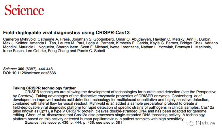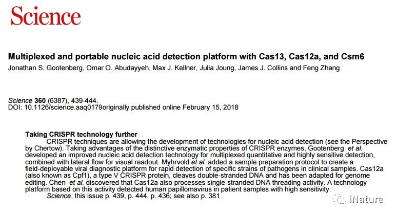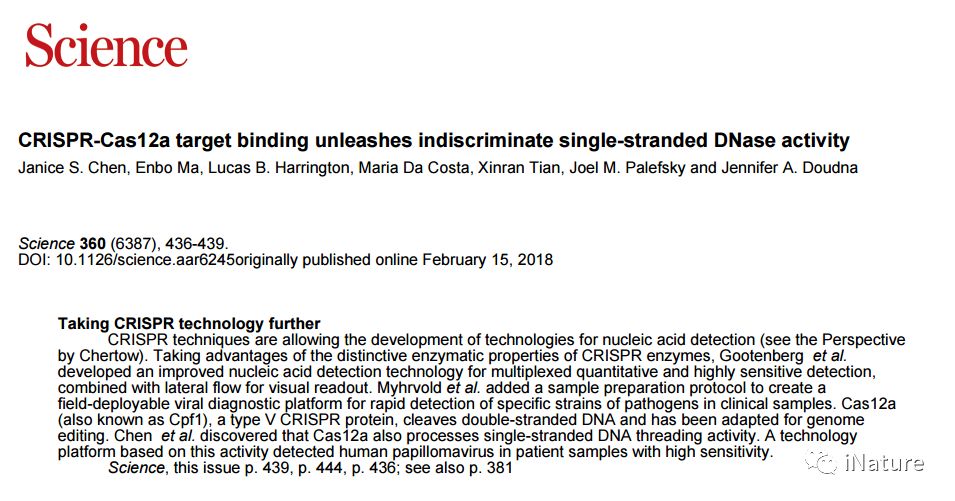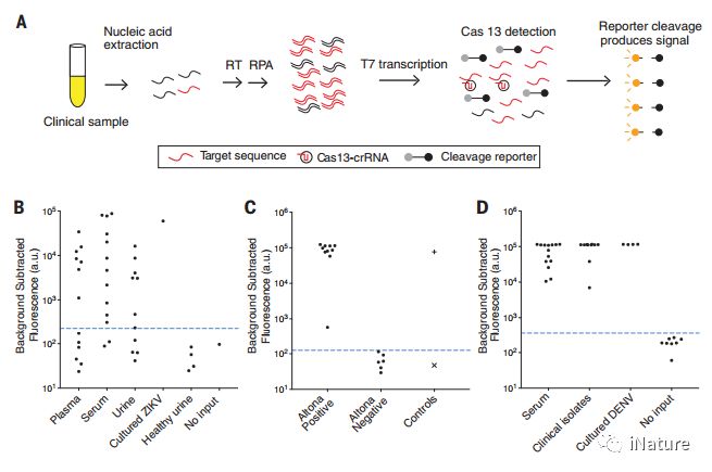 iNature:2018年4月27日,4篇CRISPR技术在临床诊断相关应用的文章同时在Science杂志上发表,这也是CRISPR技术在临床上应用的前奏,具有里程碑式的意义。这4篇Science文章分别是:Doudna等研究组发表了题为“CRISPR-Cas12a target binding unleashes indiscriminate single-stranded DNase activity”的研究论文,该文章首次创建了一种名为DNA Endonuclease Targeted CRISPR Trans Reporter(DETECTR)的方法,该方法实现了DNA检测的超高的灵敏度。 DETECTR能够快速,专一地检测患者样本中的人乳头瘤病毒,从而为分子诊断提供了一个简单的平台;张锋等研究组发表了题为“Multiplexed and portable nucleic acid detection platform with Cas13, Cas12a, and Csm6”的研究论文,该文章揭示SHERLOCKv2可通过侧流检测登革病毒或寨卡病毒ssRNA以及患者液体活检样本中的突变,突出其作为核酸的多路复用,便携式,快速和定量检测平台的潜力;张锋等研究组发表了题为“Field-deployable viral diagnostics using CRISPR-Cas13”的研究论文,该论文开发了HUDSON(加热未提取的诊断样品以消除核酸酶),该方案与SHERLOCK配对直接从体液中进行病毒检测,可在<2小时内直接从患者样品中进行DENV检测;Chertow发表了题为“Next-generation diagnostics with CRISPR”的研究展望,该论文谈到新兴的诊断工具必须与标准诊断进行比较以确保灵敏度和特异性,并且需要进行现场测试以确保患者护理环境的性能,因为环境条件和最终用户应用可能会影响性能。如果负担得起的话,经证实的检测方法有望在资源有限的环境中改善护理,其中未分化的发热性疾病是常态,诊断,靶向护理和感染控制方面的差距或延迟会导至传染病死亡率和传播。 1张锋开发Cas13,Cas12a和Csm6多重和便携式核酸检测平台核酸的快速检测对于临床诊断和生物技术应用是不可或缺的。张锋等研究组最近开发了一个名为SHERLOCK(特定高灵敏度酶解报告系统)的平台,将等温预扩增与Cas13组合起来检测单个RNA或DNA分子。 用Cas13酶联合治疗和诊断 通过对CRISPR酶学和应用开发的描述,张锋等研究组在此报告将SHERLOCKv2整合到四个方面:1)使用正交CRISPR酶的4通道单反应复合; 2)定量测量输入降至2 aM; 3)通过将Cas13与辅助性CRISPR相关酶Csm6组合,使信号灵敏度提高3.5倍; 和4)横向流动读出。 SHERLOCKv2可通过侧流检测登革病毒或寨卡病毒ssRNA以及患者液体活检样本中的突变,突出其作为核酸的多路复用,便携式,快速和定量检测平台的潜力。 原文链接: http://science.sciencemag.org/content/360/6387/439/tab-pdf 2张锋等研究组开发开发了HUDSON(加热未提取的诊断样品以消除核酸酶)检测病毒新型方法缓解全球传染病需要诊断工具,这些工具是敏感的,特定的,并且可快速部署。 在这项研究中,张锋等研究组证明了基于Cas13的SHERLOCK(特异性高灵敏度酶解报告基因解锁)平台可以检测患者样本中的寨卡病毒(ZIKV)和登革病毒(DENV),浓度低至每微升1拷贝。 来自患者样品和临床分离物的ZIKV和DENV检测 张锋等研究组开发了HUDSON(加热未提取的诊断样品以消除核酸酶),该方案与SHERLOCK配对直接从体液中进行病毒检测,可在<2小时内直接从患者样品中进行DENV检测。 张锋等研究组进一步证明SHERLOCK可以区分四种DENV血清型以及2015-2016流感大流行的ZIKV地区特定菌株。 最后,张锋等研究组报告了快速(<1周)的无仪器检测方法的设计和测试,以检测临床相关的病毒单核苷酸多态性。 原文链接: http://science.sciencemag.org/content/360/6387/444 3Doudna研究组使用CRISPR-Cas13进行现场部署的病毒诊断CRISPR-Cas12a(Cpf1)蛋白是RNA引导的酶,其结合并切割DNA作为细菌适应性免疫系统的组分。 像CRISPR-Cas9一样,Cas12a基于其产生靶向双链DNA(dsDNA)断裂的能力而被用于基因组编辑。 Cas12a靶标识别激活非特异性ssDNA切割 Doudna等研究组发现目标激活的非特异性ssDNase切割也是其他V型CRISPR-Cas12酶的特性。 通过将Cas12a ssDNase激活与等温扩增相结合,Doudna等研究组创建了一种名为DNA Endonuclease Targeted CRISPR Trans Reporter(DETECTR)的方法,该方法实现了DNA检测的超高的灵敏度。 DETECTR能够快速,专一地检测患者样本中的人乳头瘤病毒,从而为分子诊断提供了一个简单的平台。 原文链接: http://science.sciencemag.org/content/360/6387/436 4Doudna研究组使用CRISPR-Cas13进行现场部署的病毒诊断快速准确地识别传染病对于优化临床护理和指导感染控制和公共卫生干预以限制高度专业化的医疗中心和远程医疗保健机构中的疾病传播至关重要。理想的诊断测试价格低廉,准确,并能迅速提供结果,可在多种样本类型上进行即时使用,无需专业技术人员,辅助设备或电源。对偏远地区出现但可能在全球范围内传播的高致病性病毒(例如埃博拉病毒和中东呼吸综合征冠状病毒)的这种测试将有助于早期发现病例并进行隔离,从而限制疾病传播并促进及时护理。 原核生物(细菌和古细菌)具有通过CRISPR和CRISPR相关(Cas)蛋白介导的遗传适应性免疫的前哨基因,发现导至了分子生物学领域的变革性进展,其中最显著的是基因编辑。在本期的第436,444和439页,Chen等人,Myhrvold等人和Gootenberg等人分别强调了CRISPR-Cas生物学的发展如何通过在人类中检测寨卡病毒(ZIKV),登革病毒(DENV)和人乳头瘤病毒(HPV),将彻底改变传染病分子诊断领域样本和非传染性疾病,例如检测肺癌患者的循环无细胞DNA中的基因突变。 这些新兴的诊断工具必须与标准诊断进行比较以确保灵敏度和特异性,并且需要进行现场测试