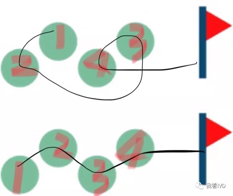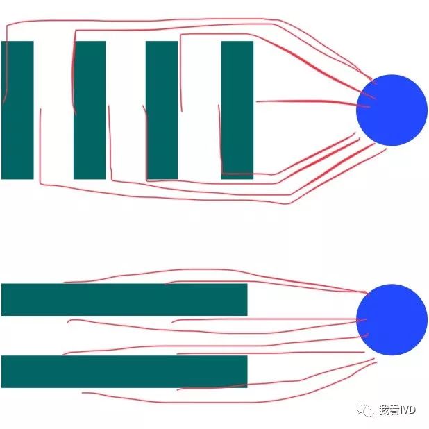在实际设计中,我们要考虑科室人员的安全,很多医院是开放式的门诊采血设计,我个人不是很认可,万一哪个病人失控了,直接桌子一翻就进到实验室里面了,岂不是危险?还是上图式的玻璃格挡更为美观和安全! 3,全面考虑现在和未来的原则 把检验科看作一个工厂的话,其实问题会简单化,工厂里工人要坐的下,机器要摆的下,机器的水电网络要够用,机器的物料要有仓库摆的下,工厂效益好了要加工人,要加机器,你也得准备好地方和各项条件。 所以,这一点不难,难在用心,我们需要用心规划和考虑现在和未来的各项条件,老实说非常耗心力很累很累!但是鲁迅(没有)说过,做事累在前面,省心在后面!反面案例,我见过两个大实验室,一个是现在都没规划好,几台发光共用一根小小的排废造成容易泛水,一个是要加机器时候发现场地内没有方便的进水和排废。正面案例,一个老实验室全面搬到新实验室,两个整天就完成了,进去就要啥有啥正常工作。 4,流程精益的原则 如果把检验科看作一个工厂,那精益管理的概念有得说了,市面上5s或者6s的管理书籍能摆满书店满满一架。我们这里不谈检验科工作的精益化管理,这里讲的是,如何设计一个实验室,让它能够实现天生的精益性。 假设在检验科天花板上装一个摄影机,快速记录科室人员的行走路线和手的操作路线的话,你将能够把一个精益实验室,和一个规划差劲实验室区别开来。一个精益的实验室,人流物流动作流的长度是最短的。如下图,红色代表人员跑动路径,蓝色台面总面积差不多,但是上下两个设计方案哪个运作起来更高效应该很明显吧。 具体设计某一块实验区域的过程中,我们还要预先了解工作流程,我们要尽量让一整个工作流程都在一条人流动作流内完成,不走回头路不走冤枉路。从这个道理上看,看一个检验科好不好,面积大小真是其次的,关键是流程合理不合理。