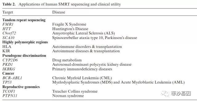 短读长大规模测序已成为医学标准的诊断工具。但短读长测序技术有其固有的局限性,如读长短、片段化、GC偏移、PCR扩增偏好性、高重复序列和大型结构变异无法识别等。而单分子实时测序技术(SMRT)解决了短读长测序中遇到的这些难题。此外,SMRT提供更高的一致性和准确性,并能直接检测DNA的表观遗传修饰。第一个商业化的长读长单分子平台是基于PacBio的单分子实时测序技术(SMRT)的RS系统,现已发展成为RSII和Sequel系统。下面,本文将介绍SMRT测序运用在生殖、癌症、微生物和病毒基因检测中的创新。 现代医学基因组学的研究与诊断十分的依赖DNA测序。测序技术在整个人类的生命周期中都具有广泛的运用,从产前诊断到新生儿筛查,到罕见疾病诊断、遗传性癌症检测、药物基因组检测以及大量疾病的易感基因检测。甚至包括对后代进行筛选和植入前的基因诊断。 测序技术可以分为三个阶段:第一,第二和第三代测序。虽然早期的第一代技术提供了突破性的发现,但是测序的大变革始于“链终止”或双脱氧技术的发明,今天称为Sanger测序。Sanger测序准确率高,读长800-1000bp,通量低不适合大规模测序。Sanger测序仍常被称为“金标准”,通常用于诊断孟德尔疾病,并对高通量测序结果进行有针对性的验证。 21世纪的第一个十年带来了多种新的DNA测序方法的发展,相对于第一代测序的平台,第二代技术的读取时间要短得多同时测序通量更高。包括以Roche公司的454测序技术、Illumina公司的Solexa技术和ABI公司的SOLiD技术。尽管读长相对较短具有一定的局限性,但这些测序技术在疾病研究、外体诊断、甚至整个人类基因组的研究以及临床研究中能快速寻找致病突变。短读长限制读取基因组复杂部分、重复区域等缺点阻碍了二代测序在变异诊断检测中的实用性。 三代测序技术与第二代测序技术方法有本质的区别。以Pacific Bioscience公司的单分子实时测序(Single molecule real time sequencing,SMRT)和Oxford Nanopore的纳米孔单分子技术为代表的第三代测序技术,能进行超长读长的读取(> 20kb)。第三代测序技术最大特点是无需进行PCR扩增,可直接读取目标序列,甚至直接检测表观遗传修饰,因此假阳性率大大减少,同时避免了碱基替换及偏置等常见PCR错误的发生。同时测序时间也只有几个小时,这在诊断中非常有吸引力。虽然简单和低成本的nanopore技术正在流行,并很可能代表未来的平台,但是SMRT测序目前更加成熟,因此SMRT测序在诊断应用中更广泛。 图1 SMRT三代测序的原理 双链DNA (A);发夹适配器连接(B);荧光标记的核苷酸(C);脉间持续时间(IPD) (D, right panel);6-甲基腺苷修饰(E, left panel);循环一致序列(CCS)(F-H, left panel);带有单遍错误率的线性序列(黑色核苷酸)(FG, right panel);高质量的一致序列(H,right panel) 二三代测序的比较 表1 PacBio 与Illumina 测序平台的比较 注:数据来自2017年11月,公司网址 (www.pacb.com and www.illumina.com) 查询结果 从表1可以看出,PacBio序列更少读长更长。PacBio测序中DNA聚合酶是实现超长读长的关键之一,读长主要跟酶的活性保持有关,激光会对酶的活性造成损伤。由于在文库的构建测序过程中不需要PCR扩增,所以测序无GC偏好性。在与第二代平台的比较中,原始PacBio测序数据产生的随机误差,其错误率更高达到13-15%,但是这些错误是随机分布的。这种随机错误可以通过多次测序来进行有效的纠错。 运用领域 01 串联重复序列 串联重复导至40多个神经及神经退性或神经肌肉疾病,但是,二代测序平台对这些串联重复序列进行测序比较困难,因为读长太短,无法跨越大多数的串联重复区域。SMRT测序研究的第一个串联重复序列是FMR1 CGG repeat。健康个体携带大约30个CGG,大部分被被一个或者两个AGG单位打断。而遗传性智力障碍和自闭症最常见的原因之一是携带200多个单位的CGG重复序列,导至脆性X综合征(FXS)。Loomis等人的研究表明,可以对一个全长突变等位基因750个单元的序列进行测序,该等位基因相当于2kb的100%GC含量的重复区域,另外这种突变会发生在母性遗传中,且风险与不断增加的重复大小和更少的AGG中断有关。SMRT测序可用于确定重复序列的大小和监测中断AGG单元的数量。 因此,SMRT测序被用于临床检测中妇女的产前遗传咨询,评估后代为FXS(43-45)儿童的风险。 02 多态性区域 基因分型人类白细胞抗原(HLA)区域,对于诊断自身免疫性疾病,器官及干细胞移植器官都至关重要。该区域的基因具有高度的多态性,HLA-B是最易变的,2012年已经注释了>2000个等位基因。序列的高变异性使得这一区域很难用短读测序来读取。全长HLA可以分为三类,称为I类、II类和III类,目前主要研究的是I类和II类。对I类HLA等位基因的测序已经用PacBio- illumina方法和PacBio方法进行。许多大型的HLA分型实验室,如安东尼·诺兰研究所,正在利用或开发他们自己的SMRT测序。这使得已知的HLA等位基因的数量迅速扩大,并成为器官移植基因分型和血液干细胞移植的金标准。 03 假基因 假基因是基因组上有编码基因序列非常相似的非功能性基因组DNA拷贝,假基因与同源功能基因之间具有高度相似性,但在使用二代测序技术时,两者之间存在显著差异。而三代测序的长读长可以跨越实际的基因区域用来锚定独特的区域或相位变异来区分假基因和实际的基因。在诊断中,通常针对特定的位点或感兴趣的区域来进行测序,从而有效的降低当