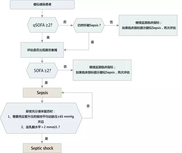 专家组认为,当SOFA评分≥2时,可以认为是感染患者出现了器官衰竭的急性变化——也就是Sepsis,可以反映约10%的综合医院疑似感染患者的总死亡风险。然而SOFA量表中许多指标是需要化验的,而且SOFA量表大多用于重症医学科的患者,其他科室用得很少。那么哪些指标是最容易体现疑似感染患者的不良预后(ICU住院天数>3或病死)呢?进行大数据分析后发现3个数据脱颖而出:收缩压(SBP)≤100 mmHg、呼吸频率≥22次/min、意识改变,这3个数据被称为qSOFA(Quick SOFA)。虽然精准度上不及SOFA,但qSOFA可以快速评估那些疑似感染患者有Sepsis的可能,能够提醒临床医务人员哪些患者需要进一步的监护,从而及时干预。 感染性休克影响因素? 如果Sepsis患者的病情进一步发展呢?那就是到达Septic Shock的程度了。Septic Shock应该是在Sepsis的基础上不仅出现了循环衰竭,还出现了细胞代谢方面的异常,其程度足以大幅提高死亡率。 为了探究哪些因素可以影响患者的死亡率,专家组又动用了大数据分析,结果有4个因素:低血压、血管升压药的使用、充分液体复苏、乳酸水平。由于各地液体复苏量的标准不同,因而专家组无法确定多少补液量是足够的,所以重点强调另外2个指标。 再次经过大数据分析后,结论是在需要使用升压药将平均动脉压(MAP)维持在65 mmHg以上时:血乳酸水平正常,其死亡率为30%左右;但当血乳酸水平>2 mmol/L时,其死亡率可达到42%。而只发生Sepsis的患者的死亡率仅8%~12%。先前已经证明血乳酸水平在评估细胞代谢水平上是极为敏感但并不特异的指标,而这个数据结果再次证实血乳酸水平在评价Sepsis患者死亡风险的突出性。 于是Septic Shock的诊断标准确立:在Sepsis和充分液体复苏的基础上,使用血管升压药才能使MAP维持在65 mmHg以上,并且血乳酸水平>2 mmol/L。