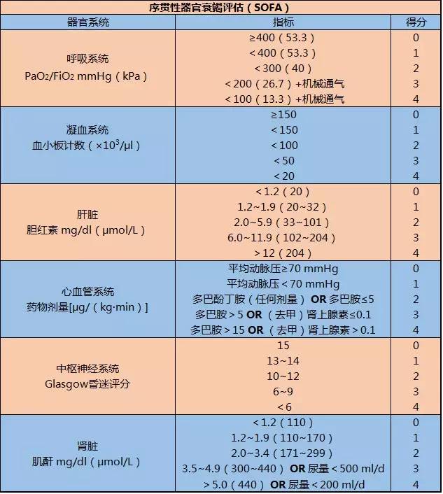 但问题是SIRS标准的特异性实在是太低了。你让一个患了扁桃体炎的男孩绕着操场跑一圈,心率100+,呼吸25次,完全“符合”Sepsis的SIRS诊断标准,难道应该直接把他抬进ICU,全身插满管子进行治疗?显然,这种过度医疗肯定不适合。临床上也有一些重症感染患者(约35%)并不符合SIRS标准,但他们却死了。越来越多的案例暴露了SIRS标准并非是诊断Sepsis最好的标准。 二十多年过去了,人们对Sepsis的本质有了更加深刻的理解,认为Sepsis其实与机体的促炎和抗炎反应的早期激活有关,进而出现了一系列如心血管、激素、代谢、出凝血、神经等非免疫性改变,这也是SIRS标准没有涉及到的。虽然抗生素、护理、疫苗等医疗技术不断发展,Sepsis仍然是感染致死的根本原因。因此,专家组认为Sepsis应该是“因为机体对感染的反应失调损伤了自身组织,从而出现的一种威胁生命的状况。” 越来越多的研究显示,Sepsis患者的预后和器官衰竭程度有直接关系,而许多新发的、现有病情不能解释的器官衰竭通常都可能存在隐匿的感染。于是专家组意识到,过去涉及器官衰竭的“重症Sepsis”或许才是Sepsis的本来面目。也就是说,Sepsis应该是感染和器官衰竭并存的,孰先孰后都不重要。 但是有一点是非常明确的,我们现在还不可能彻底认识Sepsis,它只是不完全理解下的一个广义术语,我们现在的理解只能说更近了一步。目前为止,还没有简单明确的生物学、影像学、实验室检查等指标可以作为鉴别Sepsis患者的唯一指标。因此,专家组的工作重点在于,以现在对于Sepsis的理解,哪些指标是简单易得,并且较为精准地诊断Sepsis?显然,SIRS标准并不满足他们的要求。 你好,SOFA! 既然是和器官衰竭有关,那么评估患者器官衰竭的程度与Sepsis的治疗密切相关。现在所有评估器官衰竭的量表中,序贯性器官衰竭评估(SOFA)量表是全世界运用最广,精度最高的量表之一。