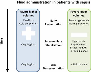 综合来说,在脓毒症的复苏过程中,我们无法从较高与较低液体容量的利弊数据中做出有力推论。但数据确实强调了在这一领域需要更好的随机对照试验。目前有几个试验项目(CLOVERS,CLASSIC, ARISE FLUIDS)正在评估脓毒性休克复苏过程中几种不同情况下液体容量方案的疗效。