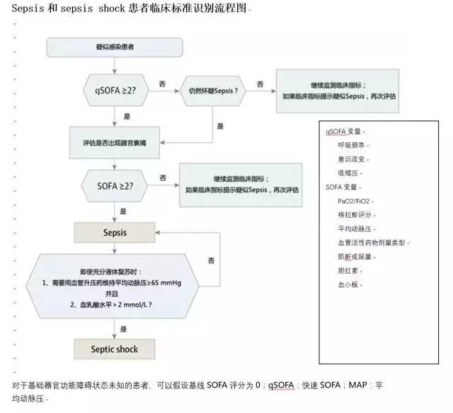 根据准确应用诊断编码的重要性的要求,表2列举了脓毒症与感染性休克新的临床诊断标准与ICD-9-CM及ICD-10编码的相关性。工作组还支持近期发表的通俗定义,即“脓毒症是一种由感染引发的机体反应对机体组织和器官本身造成损害而导至的致命性疾病”,这一概念与上述最新提出的定义相符。为向普通大众宣传脓毒症的重要性,工作组强调脓毒症可能导至死亡,尤其当未能及时发现和治疗时。事实上,尽管在疫苗、抗生素以及急性病治疗等方面取得了长足进步,脓毒症染仍然是感染导至患者死亡的主要原因。建议采取更加广泛的教育行动以帮助公众更好的了解这一致命性疾病。对于定义脓毒症 和感染性休克本身就有挑战,首先,脓毒症是一个广义的术语,用于描述一个尚未完全认知的进程,到目前为止,还没有简单和清楚的临床标准或生物、影像、或实验室特征可以独一无二的识别一个脓毒血症患者。工作组认识到不可能达到全部的共识,实用的折中方案还是需要的,所以要把重点放在诊断标准的普遍性和寻找容易测量的标识上,这些标识能最好能体现脓毒症当前根本机制的构想。然后工作组进行18个月的评议,这一过程以详细的数据作为指导,以及由专业机构进行同行审议,探询多个领域讨论的认可。明确这些问题对诊断标准的制定大有帮助,保证了最后所采纳意见的公正性。s脓毒症的新定义体现了一个最新的病理生理学观点,尤其是考虑了如何区分脓毒症与无并发症的感染。工作组也提供了一个简单可测量的的脓毒症临床诊断标准,这一标准能诠释脓毒症的本质并进行客观记录(见图)。虽然这些标准不能包括全部,但它们易于使用,为临床医生,研究者、管理人员以及资助者提供了一致的术语。SOFA评分所需要的生理和生化试验经常包括在病人的常规检查中,而且得分可以回顾获得。一开始,回顾性分析提示qSOFA可能是一个有用的临床工具,能快速的区分可能会恶化的感染患者,尤其是对于内科医生和在非ICU医务人员(甚至可能在医院外,依赖临床检查结果给出qSOFA评分),然而,由于大部分数据来源于美国的数据库,工作组强烈鼓励在美国多家医院和非美国医疗机构进行前瞻性验证研究,以确认其稳健性和纳入下次定义的潜在可能性。这个简易床边评分可能在那些实验数据不能迅速取得和脓毒症流行病学文献缺乏空白的的环 境中更加有意义。无论是qSOFA还是SOFA都不是被规定为脓毒症的独一定义,但是,很重要的一点是,患者qSOFA或SOFA评分不到2分不应该延迟对感染的观察和治疗,以及延误被医务人员认为必须关注的患者的任何方面治疗。qSOFA可以在床边快速评分而不需要抽血化验,希望它将帮助迅速识别会构成更大的威胁生命的感染。如果还没有开始进行合适的实验室检查,可能需要要进行生化检查以明确是否存在器官功能衰竭。这些数据将有助于患者的治疗,而且也能有利于接下来的SOFA评分。工作组希望强调SIRS标准可能对于识别感染仍然有效。有些人争论乳酸测定应该采纳为一个感染患者的重要的脓毒症生物学标记物,但是由于在一个qSOFA≥2 分,可能成为脓毒症的患者中,乳酸测定不能在预测效度提供有意义的变化,相比较简易床边评分标准,而乳酸测定增加了诊断的复杂性和医疗费用,工作组无法证明这一措施是正确的。工作组推荐不应该把乳酸测定捆绑为指导治疗有效性或疾病严重程度的预测指标。我们关于高乳酸血症在脓毒症休克临床诊断中的作用存在不同的观点。部分学者认为乳酸水平升高是提示非低血压性“隐性休克”的一个重要标志。另有一部分学者则表达对其特异性的担忧,担心由于血乳酸水平检测技术的不足可能妨碍脓毒症休克的诊断。目前仍没有完美的解决方案。乳酸是一个敏感的、非特异性的,独立的关于细胞或代谢应激的指标,而不是“休克”的指标。然而,高乳酸血症合并非低血容性低血压将预示高的死亡率。因此血乳酸可以为感染性休克的生理学改变及流行病学方面提供有力证据,而不仅仅用作诊断标准。脓毒症休克作为为一个独立疾病的重要性更多体现在流行病学方面,而不是临床方面。尽管高乳酸血症和低血压在临床上独立存在又密切相关,而推荐的标准与最近的其他共识不一致,临床上疾病的诊疗不能受其影响。大量数据分析对脓毒症休克发生率及其相关死亡率提供了更准确的数据。目前统计结果相差4倍。这个标准也许有助于从病理生理学方面研究脓毒症和脓毒症休克。在血乳酸水平监测不方便的情况下,通过低血压及其他支持组织缺氧的证据(如毛细血管充盈延迟)来诊断脓毒症休克是必要的。一直专注成年病人的工作小组,确认更新一些针对儿童人群的类似概念的必要性,意识到目前应用的临床标准需要考虑到与年龄相关的,在正常生理范围和病理生理反应的变化。工作组提出了新的定义,更新了包含了器官功能紊乱(方框3)在内的脓毒症生物学知识,然而,就像上面所说的,脓毒症休克与其他综合征状况类似,仍缺乏明确的诊断标准和排除标准,并且需要在各种可能的条件下进行评估。为了协助临床工作,在更准确的诊断标准没有确立的情况下,简易的临床评分(qSOFA)有助于辨别那些预后不良的疑似感染患者,因为这意味着长时间ICU住院甚至死亡。 这种方法具有重要的流行病和研究的价值。拟议的标准应该帮