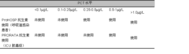 乳酸的清除 严重脓毒症患者在复苏过程中可以增加乳酸清除率,使乳酸水平较基线值下降约10%左右。脓毒性休克的患者如果存在乳酸延迟清除,则预示着预后极差。早期乳酸清除率和较好的预后密切相关,而乳酸恢复正常水平则被视为复苏治疗的目标。Arnold和其同事发现乳酸清除率为10%时,强烈提示预后较好;而对于那些乳酸几乎不清除的患者而言,这种情况预示着死亡,几乎有60%的患者会死亡。 乳酸陷阱 正如我们之前讨论过的,某些脓毒症患者乳酸水平并不升高。一项研究发现,大约45%的需要使用血管活性药物的脓毒性休克患者,乳酸水平低于2.4mmol/L,但此类患者死亡率达到20%。乳酸水平升高的患者合并较差的肝功能、急性肝损伤以及急性细菌血症的可能性更大。Hermandez和其同事发现:34%的脓毒性休克患者乳酸水平并不升高,但是这些病人的死亡率较低,约7.7%;而那些乳酸水平升高的患者死亡率高达42.9%。 另一方面,也存在乳酸水平升高,而患者确实没有脓毒症的情况。这些情况包括了:肝病,休克状态(心源性、梗阻性),创伤,癫痫,药物和中毒等(如对乙酰氨基酚, 利奈作胺,一氧化碳中毒,肌肉过度活动,吸烟,烧伤,局部缺血,硫胺素不足,糖尿病酮症酸中毒,肿瘤,遗传性代谢疾病等),因此乳酸不应该被作为孤立的生物标志物指导复苏,需要和其他指标共同使用。 降钙素原 降钙素原(PCT)是降钙素的前体肽,可由甲状腺、胃肠道、肺等器官产生,一般体内浓度极低。当患者出现细菌感染时,由于毒素及炎症因子的刺激,PCT合成增多。而病毒感染可刺激干扰素-γ合成,进而抑制PCT产生。当发生细菌感染时,PCT大约在3-6小时开始升高,6-22小时达到峰值。而感染得到控制后,PCT又以每日50%的速度下降,这一点,和其他生物标志物如白细胞计数及C-反应蛋白不同。 PCT具有多个优势,包括:特异性诊断细菌感染,发生细菌感染时PCT会同步升高,而感染得到控制后PCT亦同步下降,当患者存在中性粒细胞减少或免疫抑制状态时,PCT基本上不受影响。其他炎症状态也可能引起PCT升高,包括手术,自身免疫性疾病,副瘤综合征,长时间的休克,慢性寄生虫疾病(如疟疾),一些免疫调节药物以及重大创伤等。 抗生素管理 大量证据证实,ICU患者合并下呼吸道感染及脓毒症时,PCT可以指导医师调整抗生素使用策略,降低患者的抗生素使用率以及治疗费用,同时缩短住院时间。当发生下呼吸道感染时,尤其是慢性阻塞性肺病和支气管炎的患者,临床症状并不能清晰的指出患者是病毒感染还是细菌感染。ProResp实验随机将患者分为2组,一组是标准抗生素治疗组,另一组是PCT指导下的治疗组;在PCT指导组,当PCT低于0.25μg/L时,不提倡使用抗生素。而当PCT大于0.25μg/L时,抗生素则被应用。最终,两组患者的死亡率以及住院时间无明显差异,而和标准抗生素治疗组相比,PCT指导组显著降低了抗生素的使用率(83% vs 44%)。另一项临床研究ProHOSP试验,也得到了类似的结果,详见表3。 表3 基于PCT指导的抗生素使用研究ProHOSP和PRORATA试验