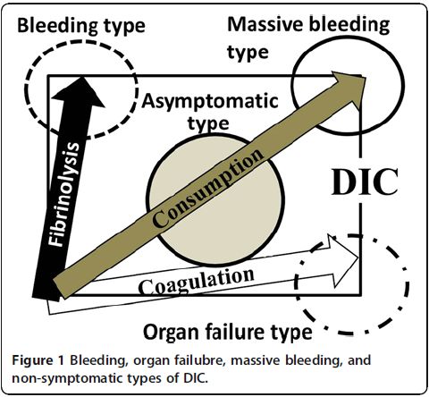 如下图所示,目前DIC主要分为四类: 出血型DIC:以纤溶亢进表现为主,例如继发于急性早幼粒细胞白血病(APL)的DIC; 器官衰竭型DIC:以凝血亢进表现为主,例如脓毒症DIC; 大出血型DIC:纤溶与凝血均显著亢进,凝血物质大量消耗,如产科、大手术DIC; 无症状型DIC:纤溶与凝血亢进均较轻微; 此外,尚有部分肿瘤相关DIC不属于上述四种类别。
