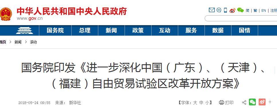国务院发布《进一步深化中国(广东)、(天津)、(福建)自由贸易试验区改革开放方案 ...