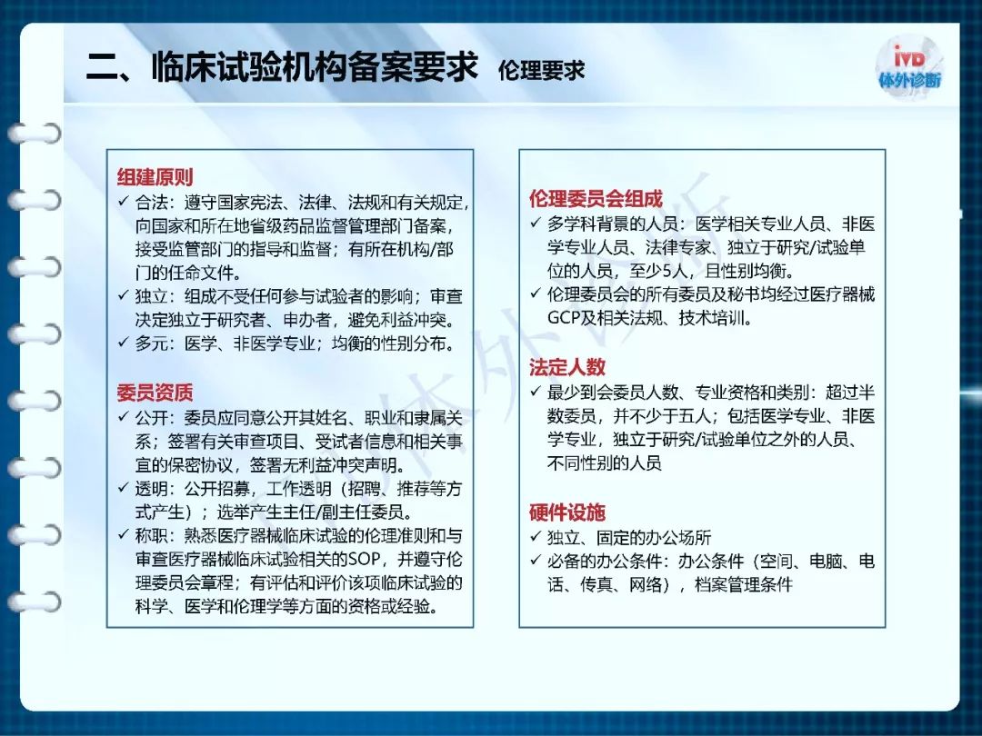 第四条 医疗器械临床试验机构应当符合医疗器械临床试验质量管理规范的要求,具备开展医疗器械临床试验相应的专业技术水平、组织管理能力、伦理审查能力等以下条件: (一)具有医疗机构执业资格; (二)具有二级甲等以上资质; (三)承担需进行临床试验审批的第三类医疗器械临床试验的,应为三级甲等医疗机构; (四)具有医疗器械临床试验管理部门,配备适宜的管理人员、办公条件,并具有对医疗器械临床试验的组织管理和质量控制能力; (五)具有符合医疗器械临床试验质量管理规范要求的伦理委员会; (六)具有医疗器械临床试验管理制度和标准操作规程; (七)具有与开展相关医疗器械临床试验相适应的诊疗科目,且应与医疗机构执业许可诊疗科目一致; (八)具有能够承担医疗器械临床试验的人员,医疗器械临床试验主要研究者应当具有高级职称,其中开展创新医疗器械产品或需进行临床试验审批的第三类医疗器械产品临床试验的主要研究者应参加过3个以上医疗器械或药物临床试验; (九)已开展相关医疗业务,能够满足医疗器械临床试验所需的受试人群要求等; (十)具有防范和处理医疗器械临床试验中突发事件和严重不良事件的应急机制和处置能力; (十一)国家食品药品监督管理总局、国家卫生和计划生育委员会规定的其他条件。 第五条 除符合本办法第四条条件的医疗机构外,其他承担体外诊断试剂临床试验的血液中心和中心血站、设区的市级以上疾病预防控制机构、戒毒中心等非医疗机构开展按医疗器械管理的体外诊断试剂临床试验,其应当具备以下条件: (一)具有相应业务主管部门发放的机构资质证明文件; (二)具有体外诊断试剂临床试验的管理部门,配备相应人员、办公条件,并具有对体外诊断试剂临床试验的组织管理和质量控制能力; (三)能够开展伦理审查工作; (四)具有体外诊断试剂临床试验管理制度和标准操作规程; (五)具有与开展体外诊断试剂临床试验相适应的诊疗科目,且应与本机构业务范围一致; (六)具有能够承担临床试验的人员,临床试验主要研究者应当具有高级职称; (七)已开展相关业务,能够满足体外诊断试剂临床试验所需的受试人群要求等; (八)具有防范和处理医疗器械临床试验中突发事件和严重不良事件的应急机制和处置能力; (九)国家食品药品监督管理总局、国家卫生和计划生育委员会规定的其他条件。