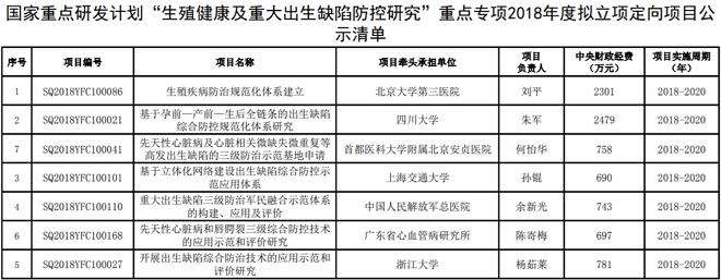 7月9日,科学技术部官网发布“生殖健康及重大出生缺陷防控研究”重点专项2018年度拟立项定向项目信息,共7个项目入围,获中央财政经费8449万元,实施周期为2018—2020年。具体如下表: