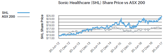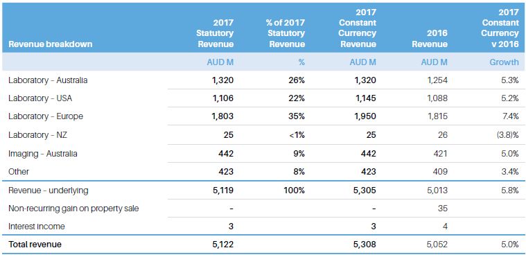 营收 2017年,Sonic Healthcare营收达51.22亿澳元,折合美金约38亿(2017 labcorp营收为 102.08亿美金)。医学诊断,影像和医学服务三大产品线分别占83%,9%和8%。 公司60%以上的营收来自海外市场,其中以医学诊断输出为主,影像类还是集中在本土市场。 澳洲本土贡献了超过1/4的营收,同时增长率超过5%。在本土深耕多年,占有大量优质实验室资源的前提下,进一步参与政府的医疗项目,使得Sonic Healthcare在本土的经营顺风顺水。另外样本收集中心价格统一,以及运输流程的优化,使得测试成本有所降低。 欧洲是目前Sonic Healthcare最大的市场,占35%的营收,且增长率达到7.4%! 德国是Sonic Healthcare在欧洲的主战场,占到近一半的营收,增长率约5%。当地业务基本都是兼并而来,经营过程中保留原有团队,对地区市场更加了解,另外,闪电收购Laboratory Bremen和the Staber laboratorygroup,给当年的成绩加上浓厚的一笔。 英国方面,敲定与Barnet Hospital 和ChaseFarm Hospital两大医院的独家协议,使得增长稳步提升,该协议能给Sonic Healthcare每年带来至少1200万美金的收入。 除了CPL系列实验室继续稳定营收外,新成立的三家医学实验室正式投入运营。总体贡献了US 4.4% 的增长。 影像方面,因政府导向的影像项目在2017年有所减少,使得总体增长只有1.7%,另外政府和媒体对影像类,自费部分的负面解读也有一定影响。 Fig 7. SonicHealthcare各区域营收情况 Fig 8. SonicHealthcare本土及国际市场营收情况 从过去6年的股票表现来看,市场对这支优质三方实验室股还是非常认可的,连续5年跑赢ASX200,股价也是持续走高。 Fig9. Sonic Healthcare 2012至2017股价情况 策略简介 1. 坚持质量至上, 持续完善体系 作为一家超过30年的公司,Sonic Healthcare对质量之重视,体现在每个员工,每个工作环节中,正如它家不成文的箴言‘Quality is in our DNA’一样。在每个分公司或者被收购方,都一如既往的保证质量管控的品质,积极适应当地最严格的质控体系,高标准的体系也为后续在世界各地的拓展,肃清了技术性的障碍。 2. 坚持国际化战略,保持本土化管理 早在2000年,Sonic Healthcare的管理层便认识到澳洲市场有限,确立了国际化的战略,积极寻找发达国家优质的三方实验室,影像公司及设备公司,以直接收购,合资或部分入股的方式获得这部分资源,不断完善自身产品线的同时,迅速切入不同市场。 同时,在每个新进入的市场,给与当地分公司高度自主权,分公司CEO能独立决定运营事务,甚至部分当地的并购业务。员工也以本地团队为核心,在推广运营中,保持着Local Flavor。 3. 依托优势地位,吸取优质资源 作为全球第三大的三方医学实验室提供商,澳洲,德国,瑞士,英国最大,美国前五的私立实验室运营方,澳洲三方影像第二大,同时也是最大的医学服务提供商。 无比强势的市场地位,使得Sonic Healthcare在获取市场信息,争取优质资源,较其他对手,优势明显,利用现有的设施和资源,能够更加从容地参与各地项目。在发达地区,小实验室及诊所,因市场压力,不断被兼并的时期,Sonic Healthcare这类大型连锁实验室能够很好的吸纳这部分流量。 另外,作为产业领先公司,在争取政府项目时,也有更多斡旋的空间,使得资源更大程度往己方倾斜。