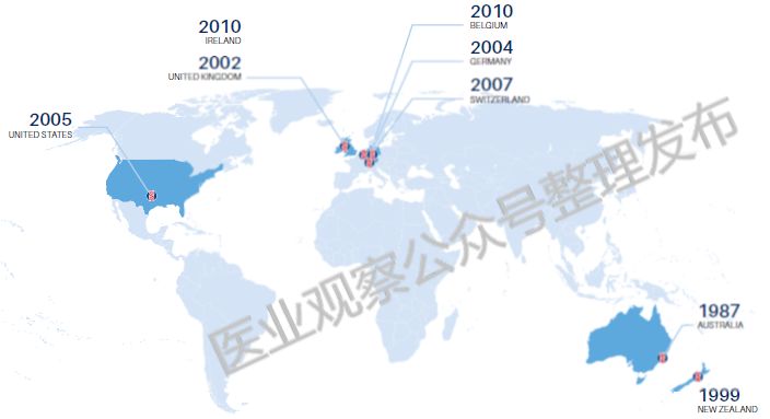 Fig 1. 2017年Sonic Healthcare全球员工分布 Fig 2. Sonic Healthcare Headquarter Sydney Fig 3. CBL Path New York, USA Fig 4. Bioscientia laboratory, Ingelheim, Germany 公司以五个方面为基础,力图成为医学的领导者: Respect for our People Professional & AcademicExpertise Operational Excellence Company Conscience Personalized Service forDoctors & Patients 除此之外,对每个Sonic Healthcare的员工而言,有一个不成文的箴言,即‘Quality is in our DNA’,并将这条箴言应用于临床,操作和工作环境及体系中,全球通用。 收购兼并 像其他的三方实验室巨头一样,SonicHealthcare的发展也是伴随着一次又一次的收购兼并,直到现今成为ASX(AustralianSecurities Exchange) 前50,世界前3实验室的公司。 在发展的过程中,公司清楚认识到,单纯靠在澳洲市场拓展,能够获得的机会很有限,而且当地的收入很大程度取决于政府的医疗资金,所以在早期便确定了国际化的发展战略。 到2016年,公司超过60%的收入来自澳洲以外的市场。这在全球都是极为罕见的。 下面看看每一个阶段Sonic Healthcare 是如何进行买买买的: