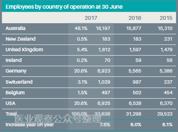 公司概况 总部位于悉尼,除澳大利亚外,Sonic Healthcare还向包括新西兰,英国,德国,瑞士,美国等各地区提供实验室,病理性和放射学服务,目前是澳大利亚最大,全球第三大的医学实验室提供商,也是国际化最为成功的医学实验室。 全年测试量高达1.08亿。拥有超过33000名员工。员工分布方面,在澳洲以外的员工占比超过一半,可以看出目前Sonic Healthcare在业务上的侧重,从单一的区域服务供应商,逐步转化为全球各地专业的医学实验室提供商。