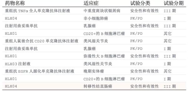 国内企业单抗药品布局 不包括融合蛋白,目前仅6个国产单抗品种在中国上市,而美国仅第四代单抗就已经有11个产品上市,欧盟获批的第四代单抗药品有12个,差距显而易见。上市公司中,三生制药(01530.hk)、泰合健康(000790.sz)、康弘药业(002773.sz)、海正药业(600267.sh)已有单抗产品上市;我们选取国内在单抗领域研发实力较强的部分企业对其主要在研品种做一简要盘点。 复宏汉霖 上海复宏汉霖生物技术有限公司,是复星集团控股子公司,是由上海复星医药(集团)与美国汉霖生物制药公司于2009年12月合资组建。复宏汉霖是中国单抗研发实力靠前的企业,在研管线丰富,包括生物类似物、改良型单抗、创新型单抗、双特异性单抗和抗体偶联药物五大研发板块。 公司品种中进度最快的是利妥昔单抗,已于2017年底提交上市申请。其他品种如曲妥珠单抗类似药,阿达木单抗类似药的研发也在推进中。CDE数据显示,目前公司正在开展临床试验的项目有11个,其中4项试验已经进入临床三期。 表:复宏汉霖在研药品临床试验情况表