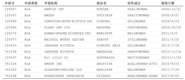1986年全球第一个鼠源性单抗药物Muromonab OKT3问世,至今单抗药物已经发展到第四代全人源化单抗。人源化单抗可以避免鼠源单抗抗体反应,提高单抗分子的生物学活性。针对目前最先进的第四代单抗,本文盘点了国内外产品上市情况,并简要分析了国内主要单抗研发企业的产品管线。 第四代全人源化单抗美国上市情况:FDA共批准11个四代单抗药品 截至2018年7月已经有11个全人源化单抗药物在美国FDA获批上市,其中有2个是生物类似药。最早在FDA获批的人源化单抗药物就是大名鼎鼎的阿达木单抗(ADALIMUMAB),商品名HUMIRA(中文:修美乐),是由总部位于美国芝加哥的艾伯维公司(AbbVie)生产,获批时间是2002年底。HUMIRA用于类风湿性关节炎治疗,生产厂商艾伯维公司财报显示HUMIRA 2017年全球销售额达到惊人的184亿美元,较上年增长26.9亿美元,增速达到17%,连续第六年位居全球药品销售榜榜首。2016年美国安进公司(Amgen)阿达木单抗的生物类似药AMJEVITA在FDA获批上市,这也是阿达木单抗的首个生物类似药。17年勃林格殷格翰的CYLTEZO获得FDA上市许可,成为第二个获批的阿达木单抗生物仿制药。 最新获批的第四代全人源化单抗产品是勃林格殷格翰公司生产的生物类似物Cyltezo,获批时间是2017年8月25日。Cyltezo是修美乐的生物类似药,用于类风湿性关节炎等自身免疫性疾病的治疗。