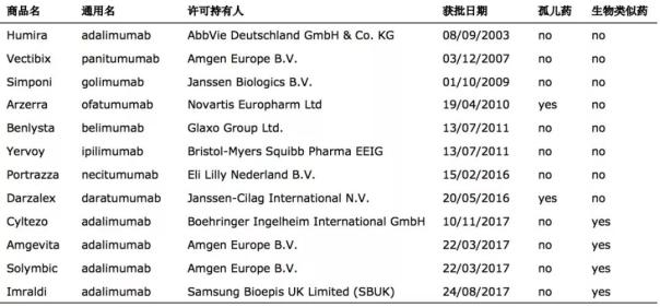 第四代全人源化单抗欧盟上市情况:共有12个四代单抗药上市 截至2018年7月,共有12个四代单抗药物(不包括2个撤回品种)在欧盟获批上市,其中有4个是生物类似物。可以看出,虽然欧盟批准的第四代单抗药物数量比美国多,但新上市的药品数量却不如美国。 艾伯维的阿达木单抗2002年在FDA获批后紧接着2003年年中在欧盟获批。值得注意的是,在12个获批的四代单抗药物中,有2个孤儿药。 Ofatumumab是由Genmab原研,于2009年10月在美国FDA获批上市,2010年获得欧盟上市许可并获得孤儿药认定,是一种治疗慢性淋巴细胞性白血病的药品。 表:欧盟批准的第四代单抗药物